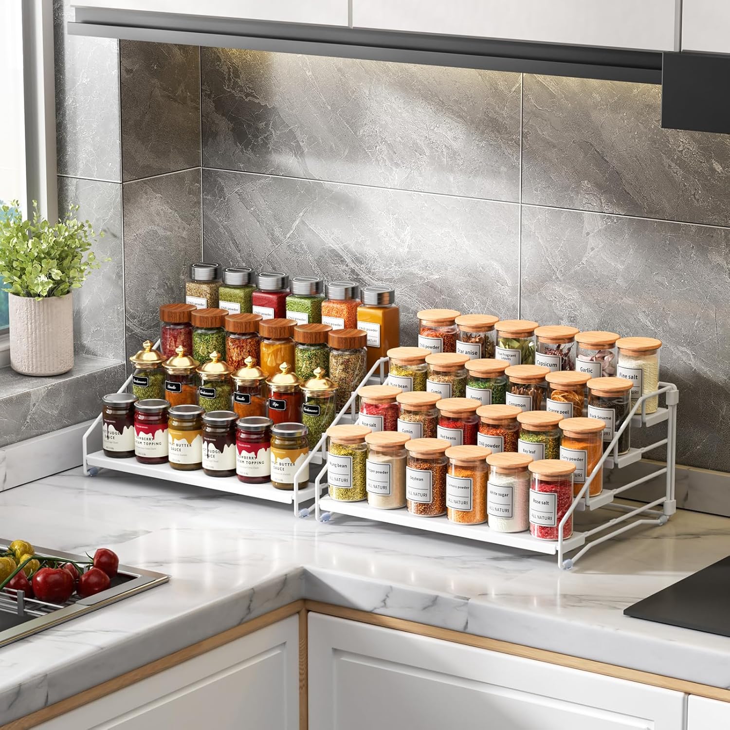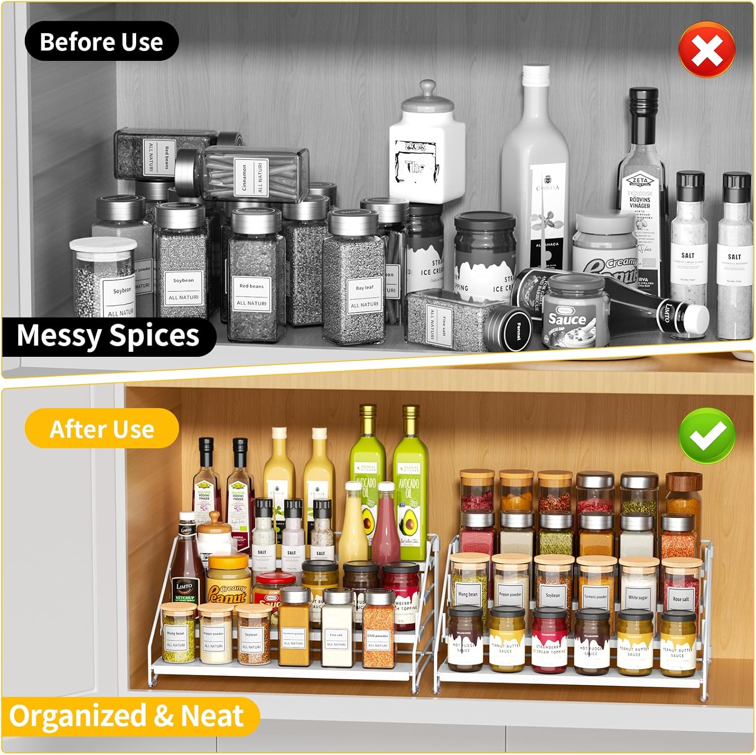 • 【Durable Metal,Strong And Sturdy】:The seasoning organizer rack made of high quality metal,sturdy frame and each tier has a sheet metal base design, provides spice bottles more stable to place and less to tip over. The surface of this cabinet organizer is smooth,with an anti-rust coating, and easy to clean with water or rag.
