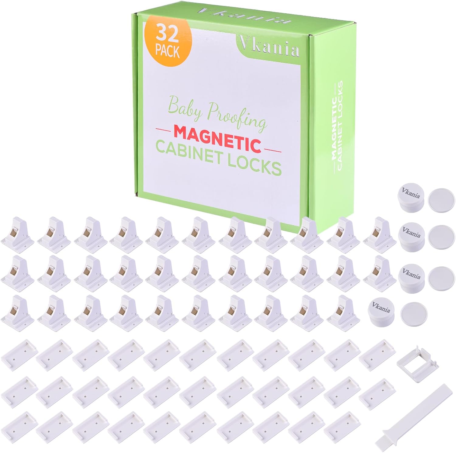 • [ 32 LOCKS + 4 KEYS ] Vkania magnetic cabinet locks are perfect for baby proofing cabinets and drawers. These child proof cabinet locks feature a strong magnetic design to keep curious toddlers and pets out. Easy to install with 3M adhesive—no tools, drilling, or holes required. Ideal for baby safety locks for cabinets in kitchens, bathrooms, and more.