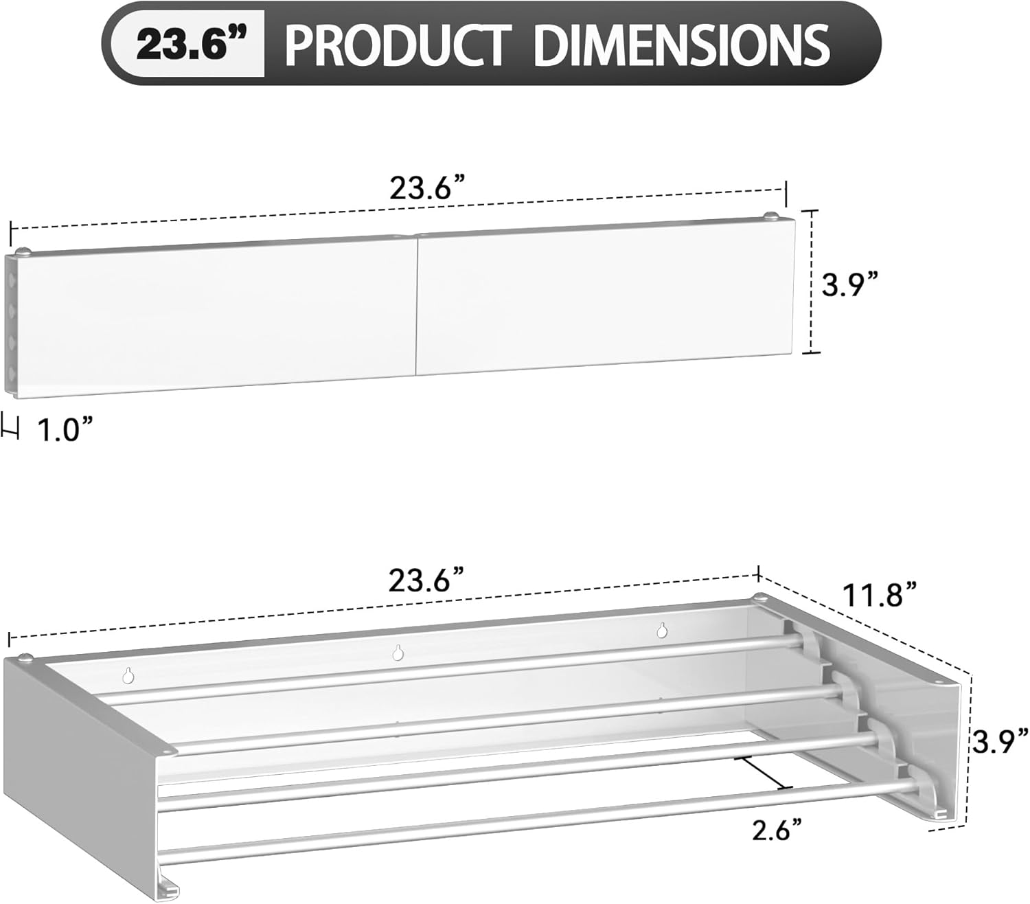 • Space-Saving Design - This laundry drying rack is adopted with collapsible design, so you can fold it when not in use; The compact and retractable wall-mounted design maximizes limited space, adds elegance to your space, and can help free up your floor space; Unfolded Size: 23.6"(L) x 15.7"(D) x 3.9"(H); Folded Size: 23.6"(L) x 1.0"(D) x 3.9"(H)