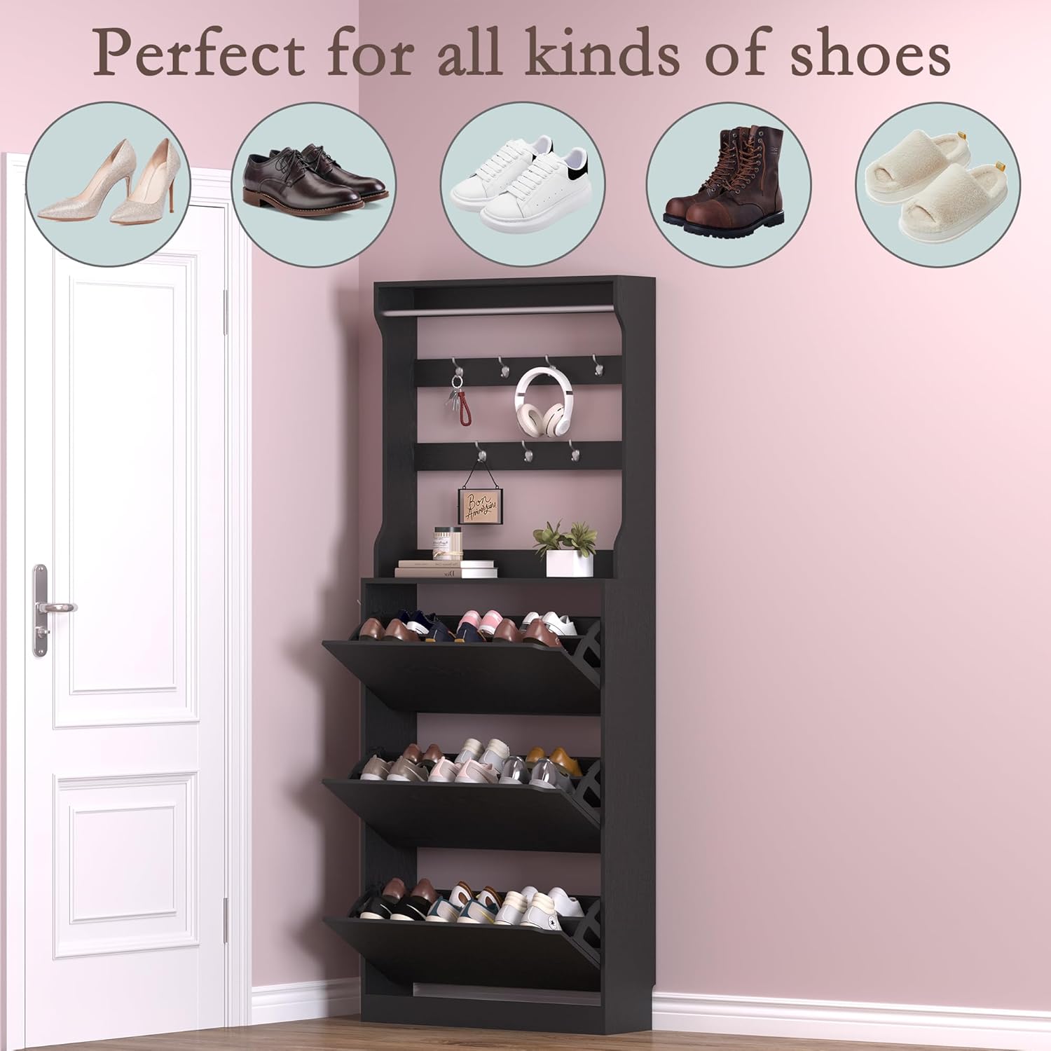 Shoe Cabinet with 3 Flip Drawers & Coat Rack, Narrow Hidden Shoe Storage Cabinet, 2-in-1 Hall Tree Slim Freestanding Shoe Rack Organizer for Entryway, Hallway, and Living Room