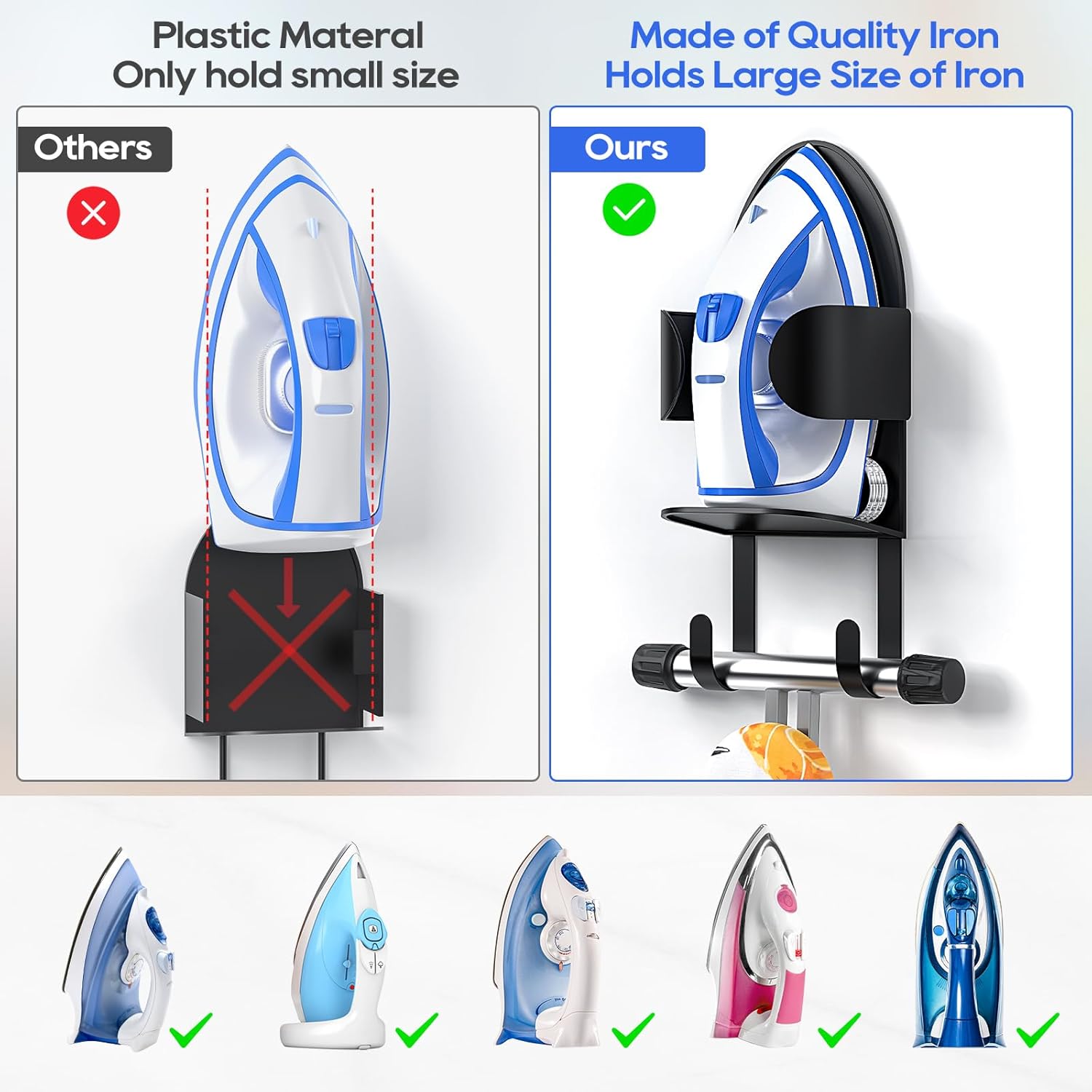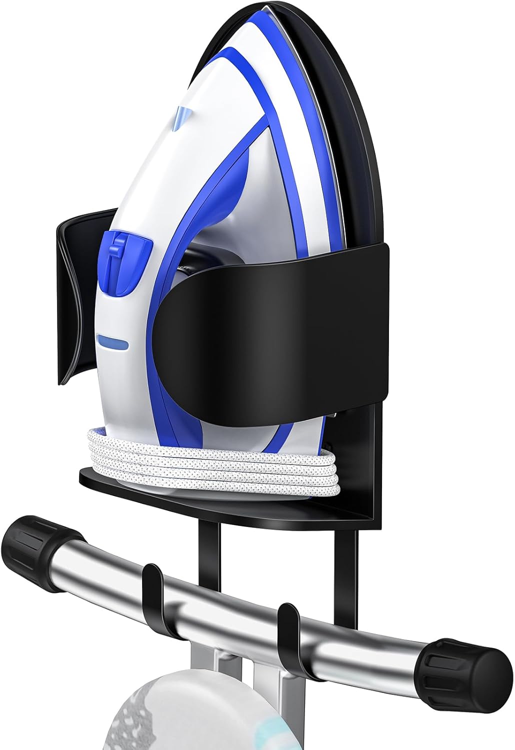 • LAUNDRY ROOM SPACE-SAVER: Store your iron and ironing board in one spot; Metal basket holds your iron. 2 long metal hooks can hang your ironing board: suitable for T-shaped ironing board legs. The hooks and basket are detachable so you can install in the location that is convenient for you.
