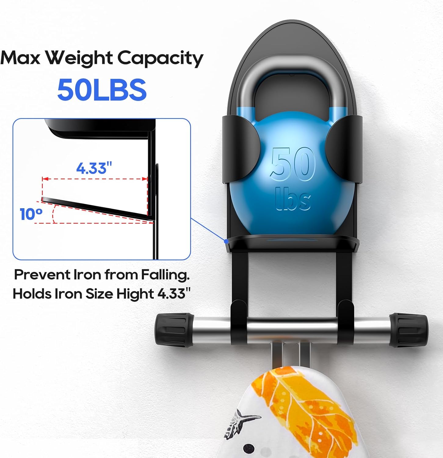 • DIMENSIONS AND LOADING: The holder’s usable space is 6.96 x 4.33 x 15.88 inch. Detachable hook feature is 2.16 inch wide. The ironing board holder supports up to 66 lbs of weight. Suitable for large iron and ironing board.