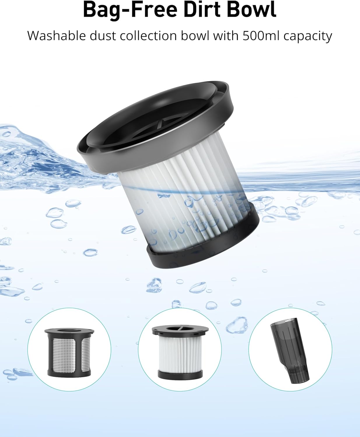 • 【Quick Solution To All Worries】 The 500ml dust collection container offers ample space for debris, while the detachable filter allows for easy cleaning, ensuring optimal performance and longevity of the cordless vacuum, Replacement Filter: B0DLBQPKTN