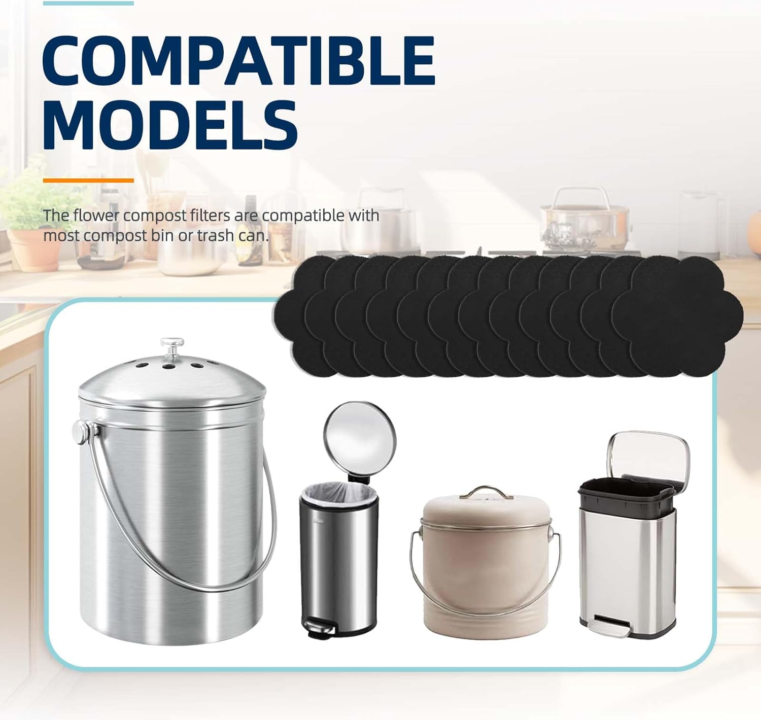 • [Easy to use and replacement] : Remove the old trash can deodorizer and fold the charcoal of the new compost box filter. You only need to remove the old garbage can odor eliminator on the trash can and stick a new compost bin charcoal filter. For different sizes of trash cans only need to cut the flower shaped charcoal filter to adapt to the size of the pail.