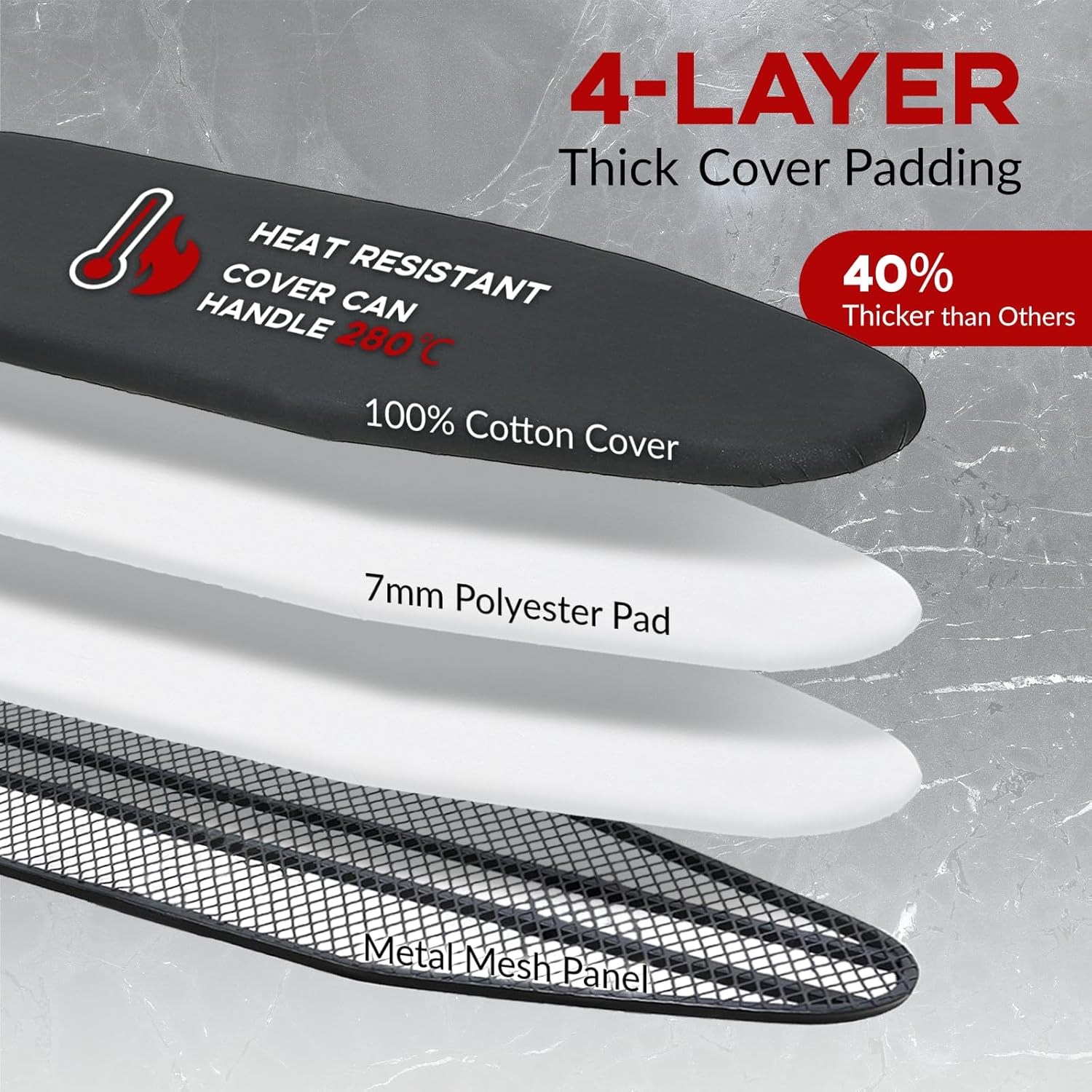 • Ironing Board Cover and Pad: Extra thick heat-resistant ironing board cover which is made of 100% cotton cover with two layers of 7mm padding absorbs heat and creates an ideal ironing surface, making the ironing task quicker and easier