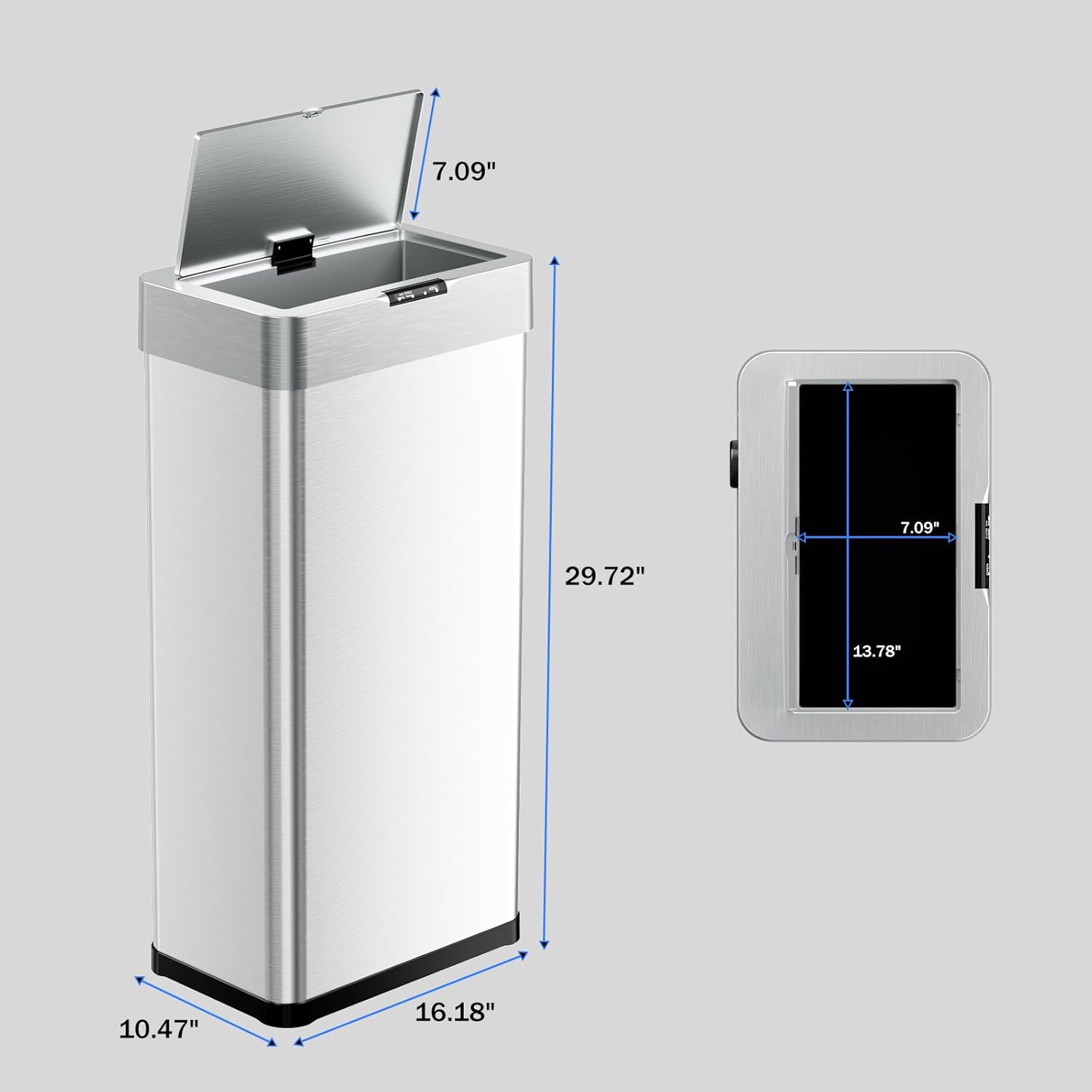 • 【Soft-Close Lid and Integrated Design】Sensor trash can lid has a slow-closing function, ensuring each closure is gentle and quiet, reducing noise and disturbance to nearby people while also enhancing the trash can's sealing ability. Trash can opening measures 13.78 × 7.09 inches, making it easy to deliver even large items