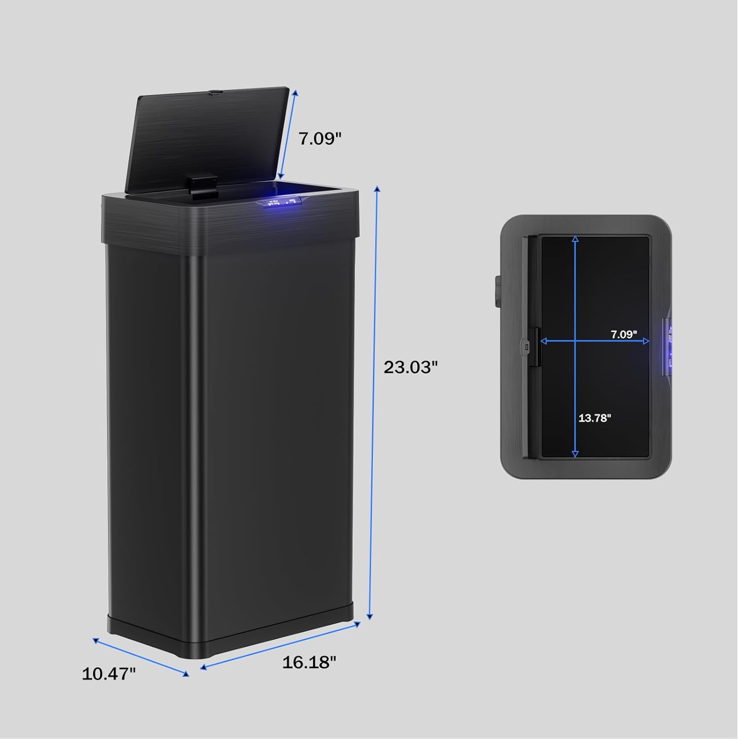 • 【Soft-Close Lid and Integrated Design】Sensor trash can lid has a slow-closing function, ensuring each closure is gentle and quiet, reducing noise and disturbance to nearby people while also enhancing the trash can's sealing ability. Trash can opening measures 13.78 × 7.09 inches, making it easy to deliver even large items