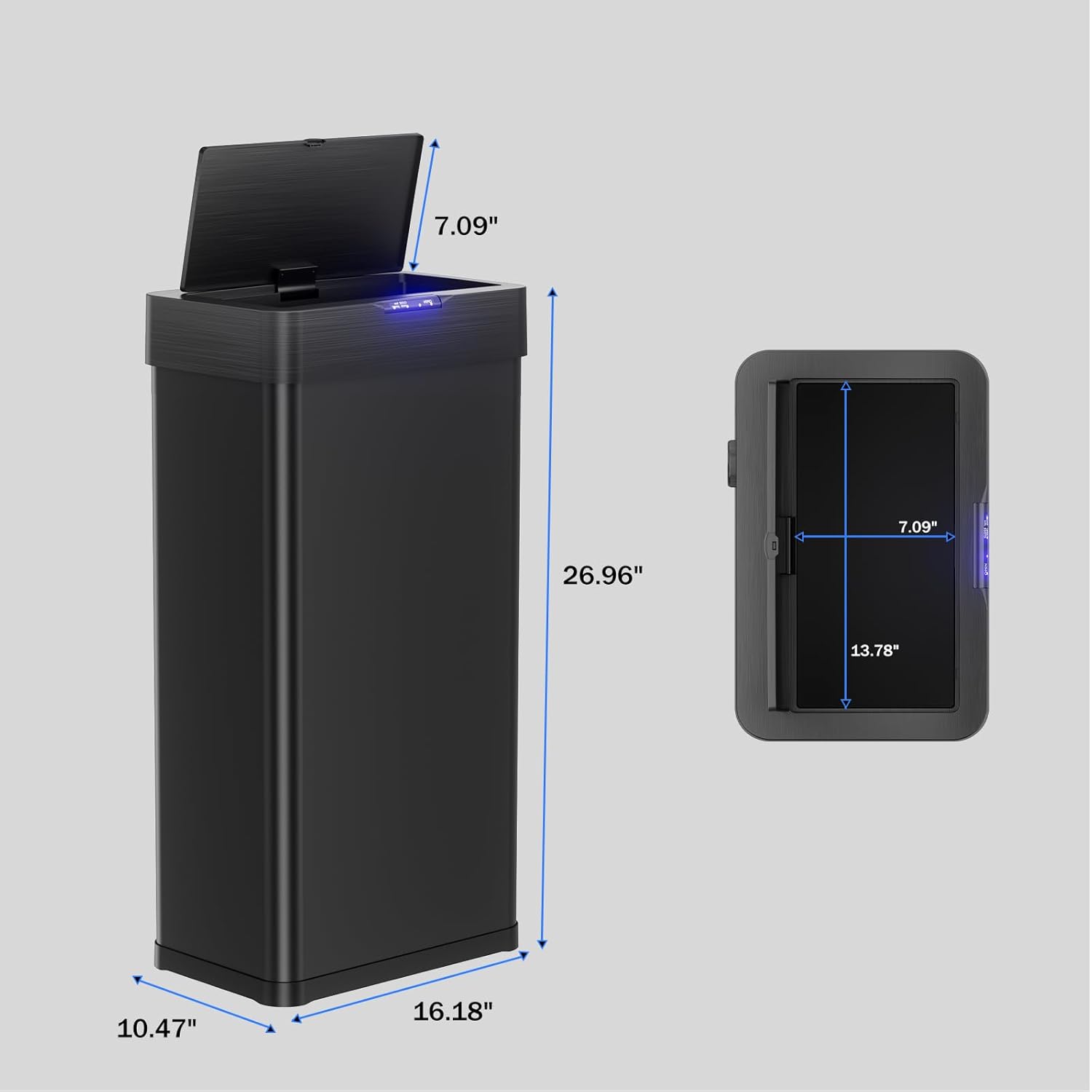 • 【Soft-Close Lid and Integrated Design】Sensor trash can lid has a slow-closing function, ensuring each closure is gentle and quiet, reducing noise and disturbance to nearby people while also enhancing the trash can's sealing ability. Trash can opening measures 13.78 × 7.09 inches, making it easy to deliver even large items