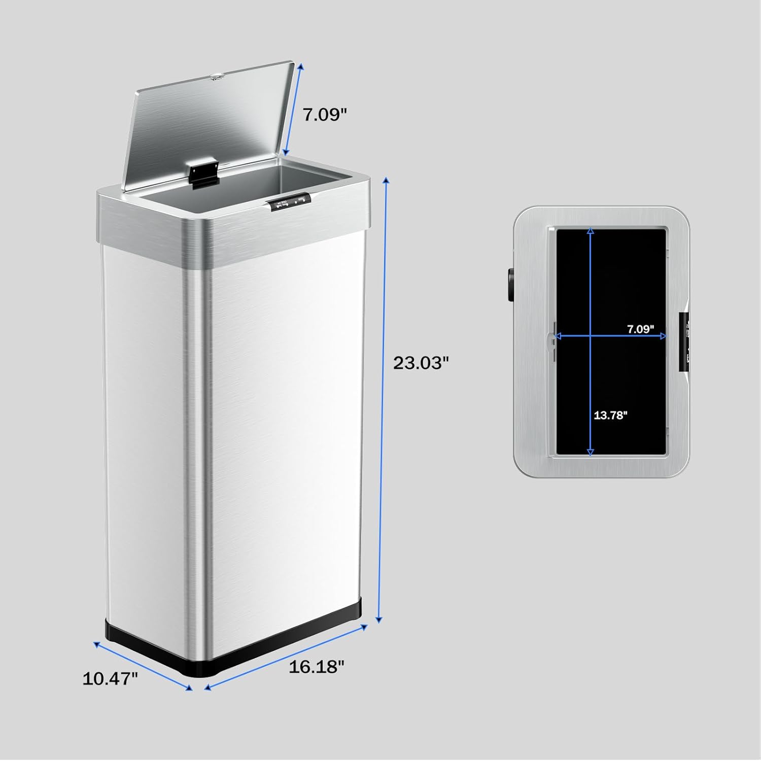 • 【Soft-Close Lid and Integrated Design】Sensor trash can lid has a slow-closing function, ensuring each closure is gentle and quiet, reducing noise and disturbance to nearby people while also enhancing the trash can's sealing ability. Trash can opening measures 13.78 × 7.09 inches, making it easy to deliver even large items