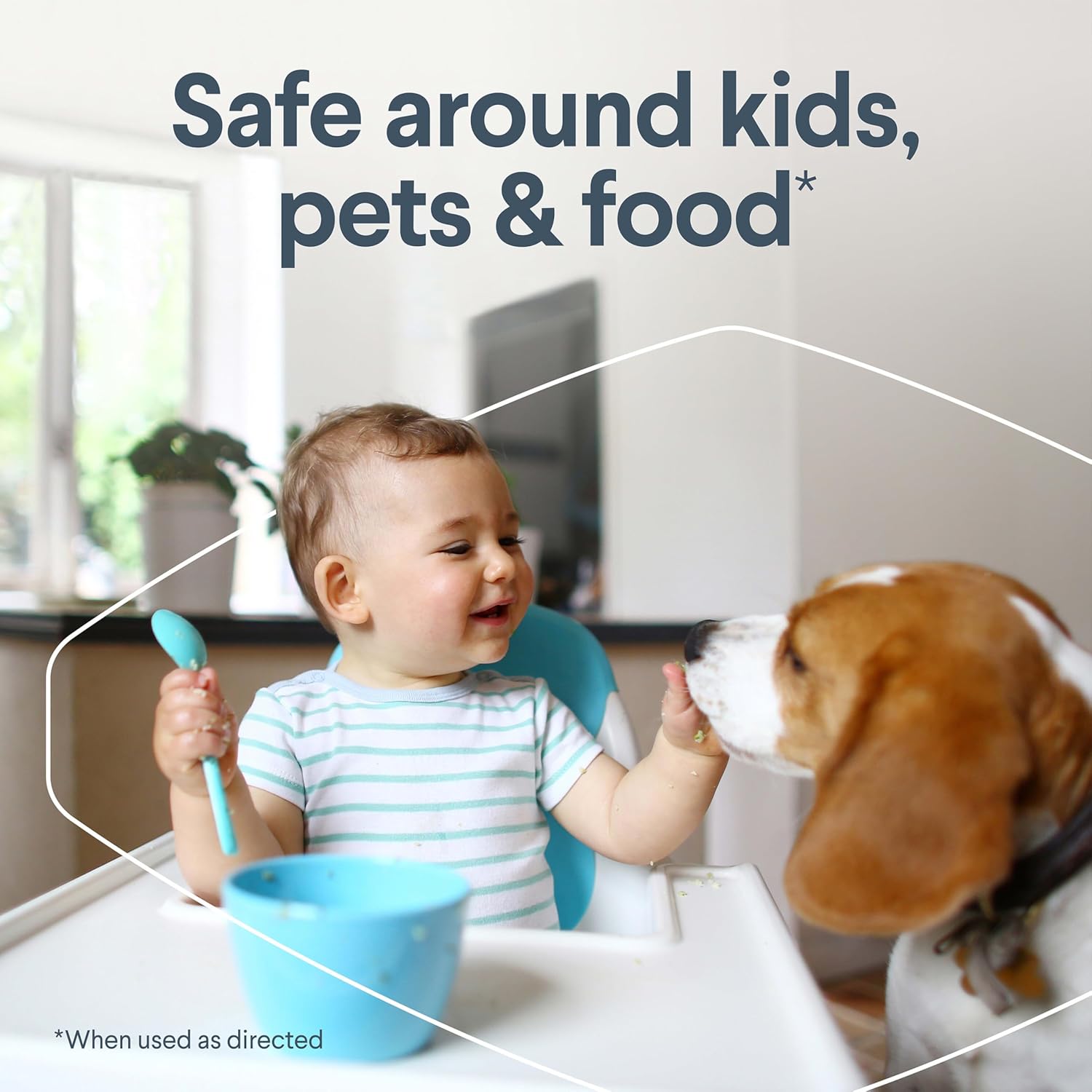 • SAFE AROUND KIDS, PETS AND FOOD*: This all purpose cleaner is great on kitchen surfaces, changing tables, high chairs, pet bowls and pet crates, and bathroom surfaces, all with no rinse required