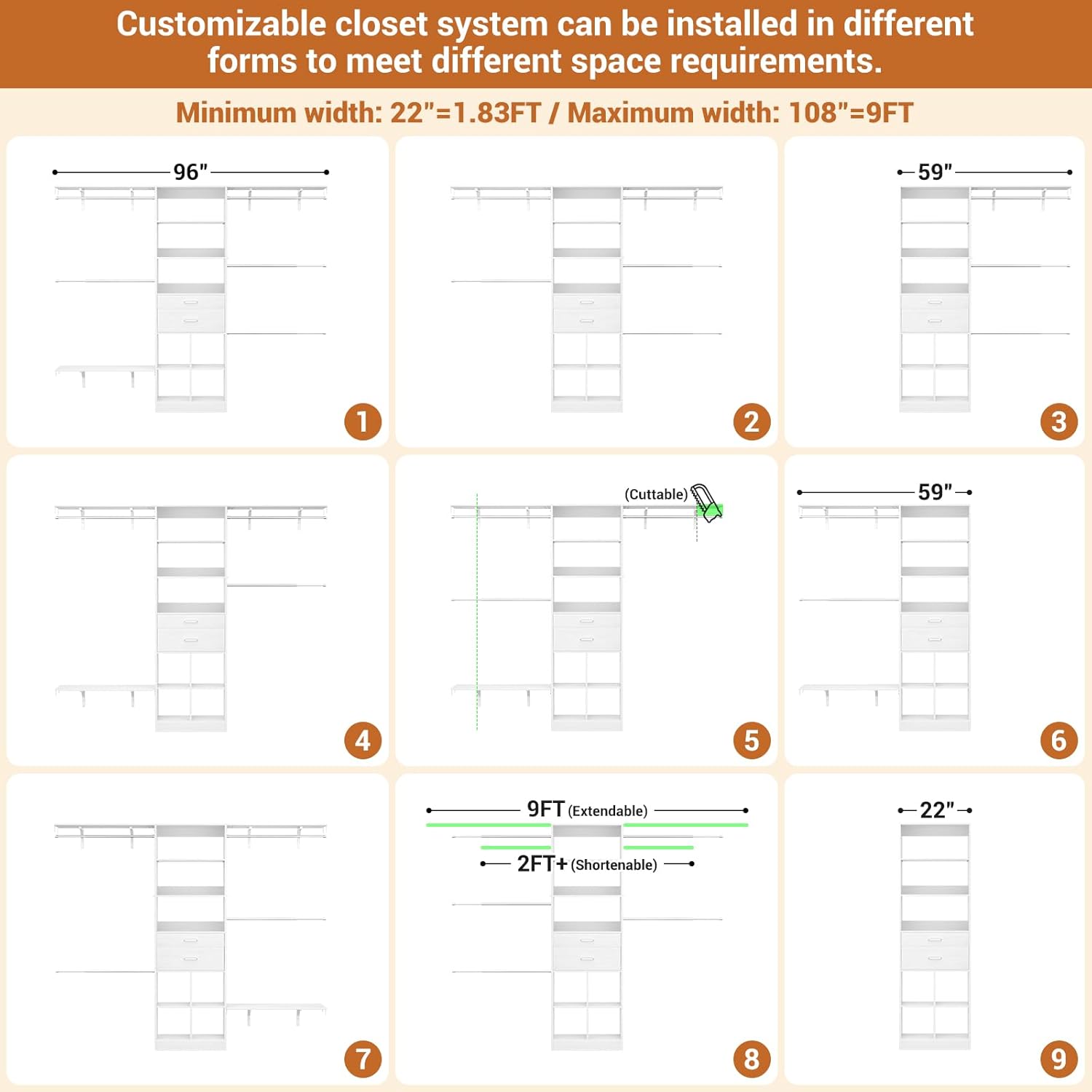 • Customizable Closet System - Besiost closet system with drawers is a valuable addition to your nursery organization and walk-in closets. The small modern closet comes with additional cuttable shelves and adjustable hanging rods, designed to fit well in nurseries of varying sizes. Width: 59"–96", Height: 80"