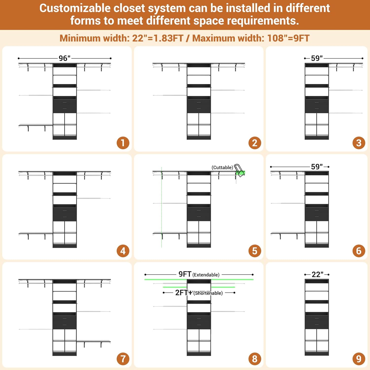 • Customizable Closet System - Besiost closet system with drawers is a valuable addition to your nursery organization and walk-in closets. The small modern closet comes with additional cuttable shelves and adjustable hanging rods, designed to fit well in nurseries of varying sizes. Width: 59"–96", Height: 80"
