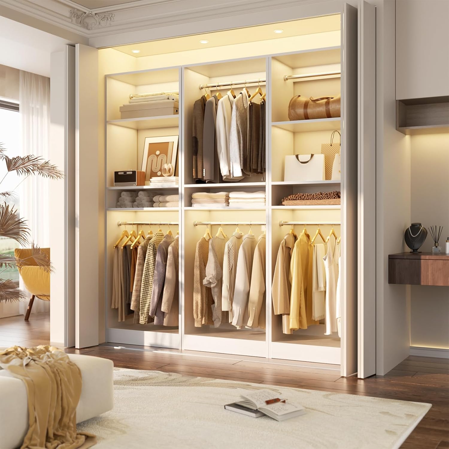 • 【Flexible and Adjustable Clothes Wardrobe】The 2 hanging rods are perfect for coat, dresses, skirts, slacks and sweaters. You can choose to use 2 hanging rods for hanging clothes, or change to use the adjustable storage shelf on the top half of the closet unit that offer plenty of open storage for folded clothes, handbags, boxes, hats or anything else. The walk in closet kit can holds up to more than 150 pieces of clothes, which make it easier to keep everything tidy and accessible.
