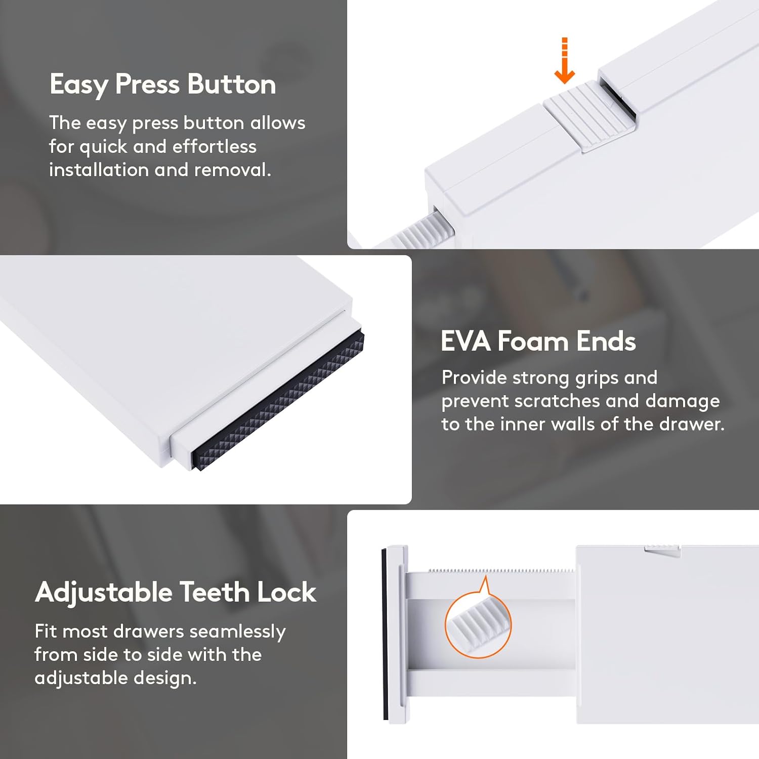 • Easy to Install: Press the top button and stretch to the desired length, then fully extend again to secure in place; The strong spring tension keeps each drawer organizer securely upright; To retract, press the top button and push the stretched side