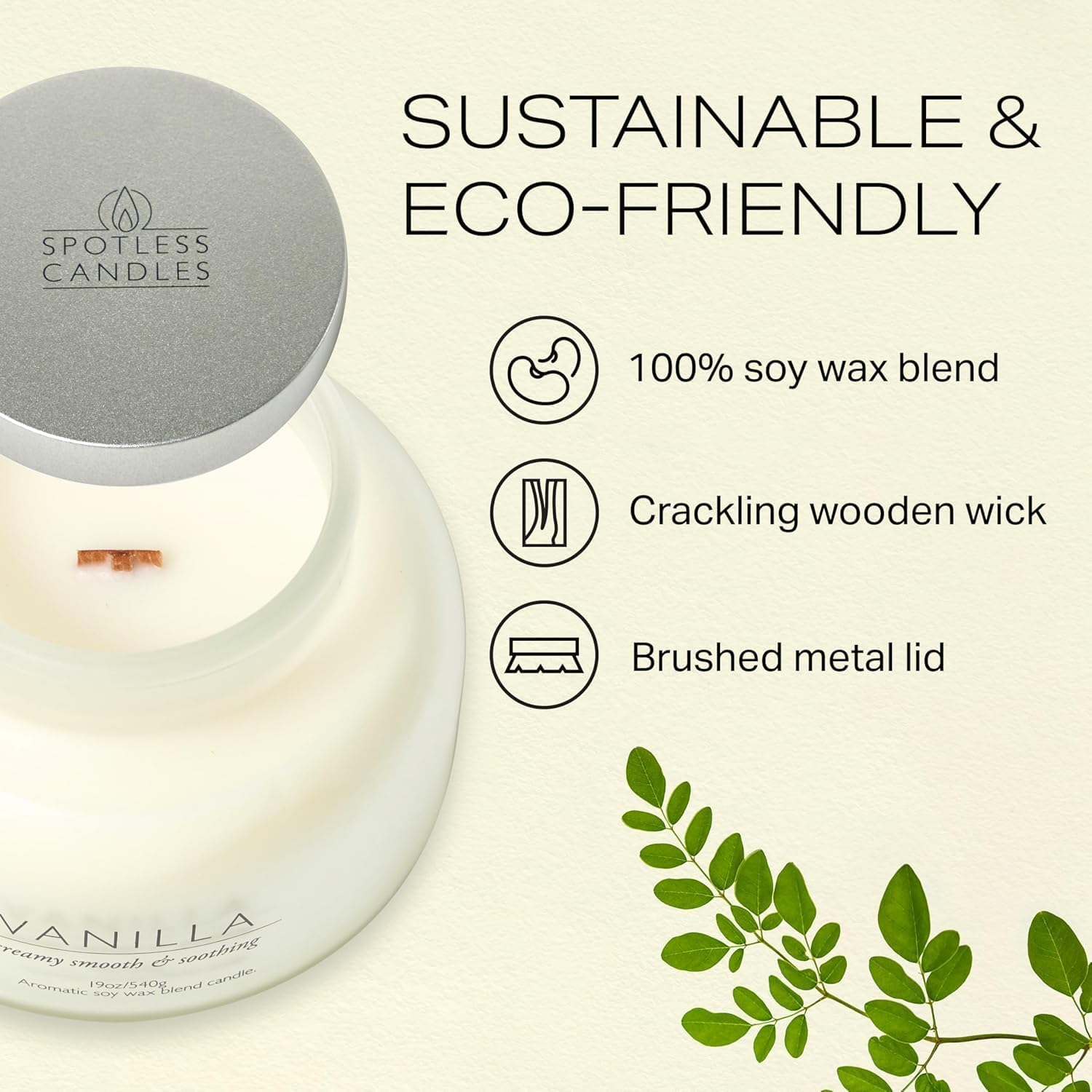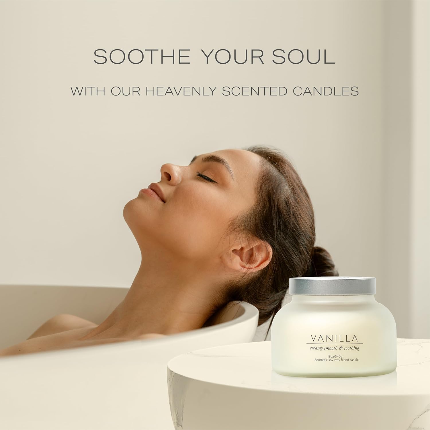 • Long-Lasting 19 oz Soy Candle for Home Our large soy candle features a clean-burning soy wax blend that provides up to 80 hours of fragrance. Ideal for daily use, this vanilla-scented candle offers a long-lasting scent experience without being overpowering.