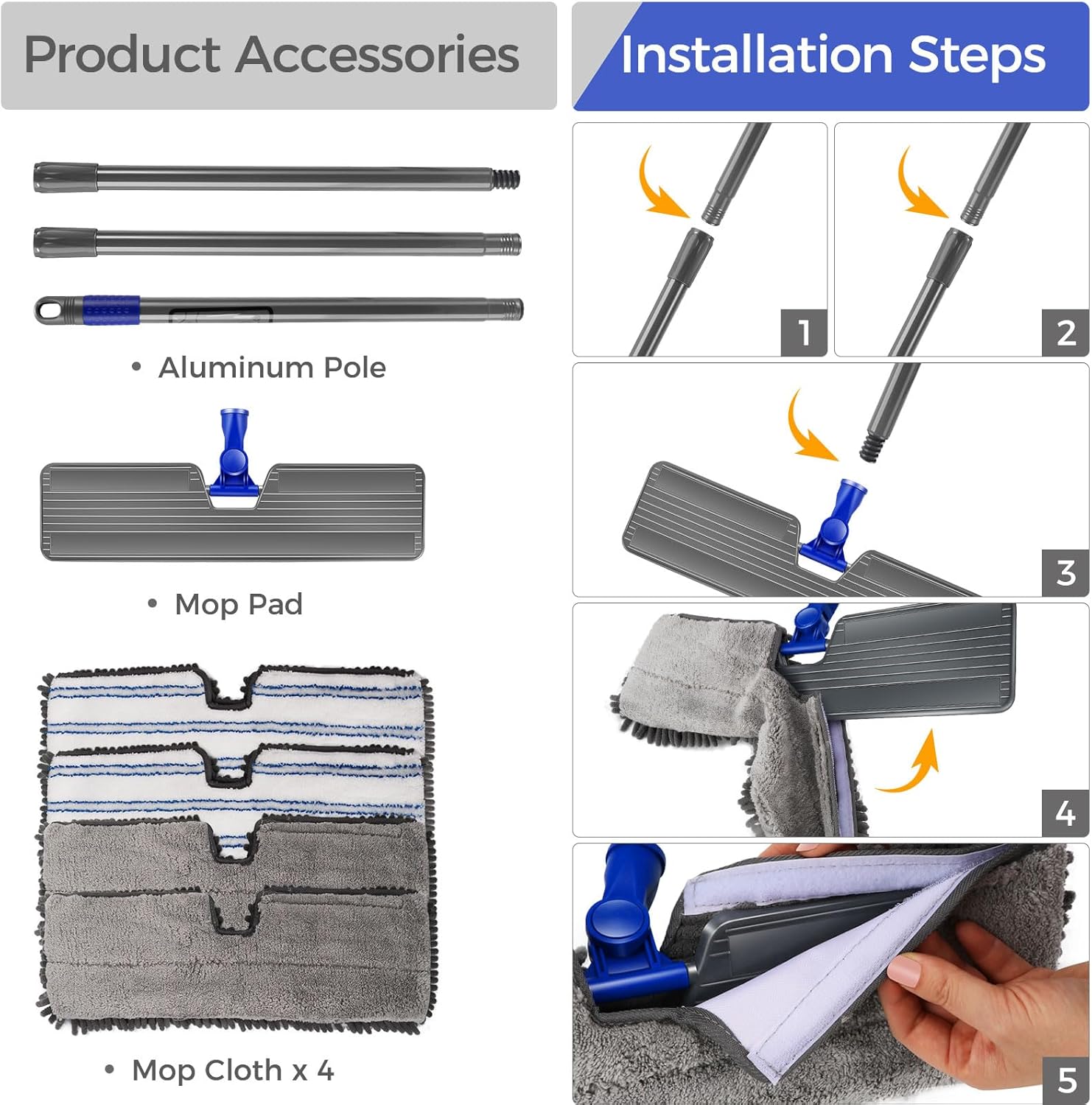 • [360° Rotating Mop Head] The microfiber mop can be flexibly rotated 360 degrees, and the Velcro design can better grip the hardwood floor mop pad, so that you can effortlessly wipe up all the spaces in the house, even some hard-to-reach corners.