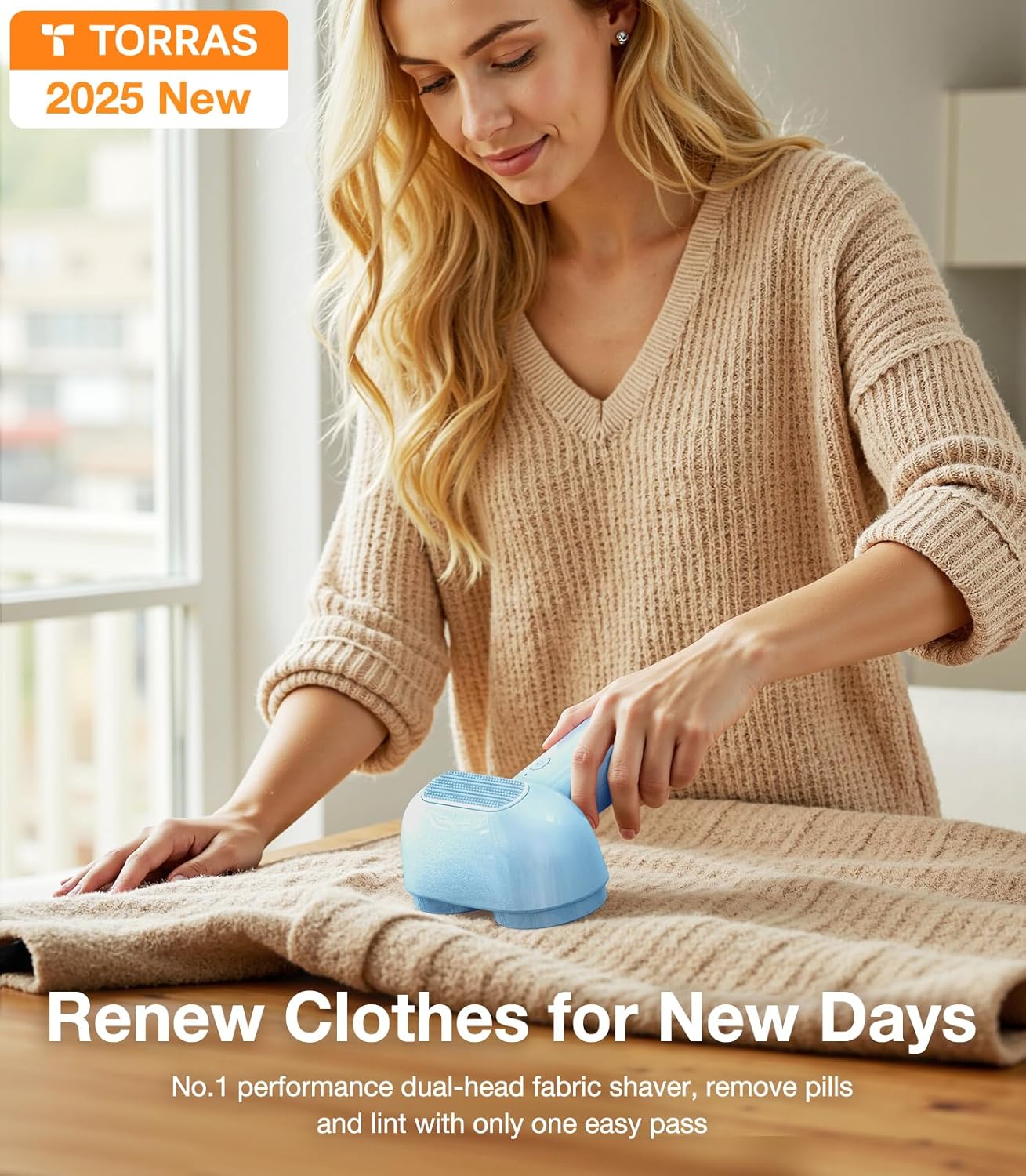 TORRAS Dual-Head Fabric Shaver, Longest Durability & 50ml Large Capacity Rechargeable Lint Removers to Remove Pills, 6-Leaf Blades Defuzzer, Electric Shaver for Clothes Couch Furniture, Sky Blue