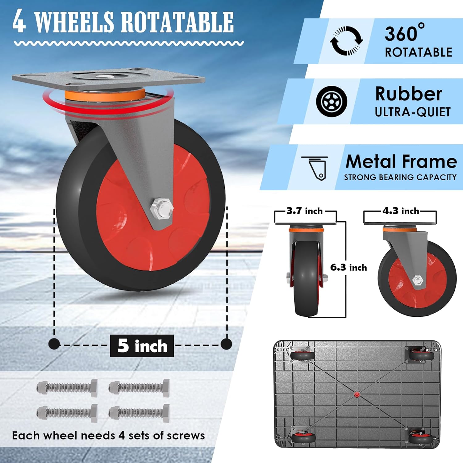• 【Equipped with 4 swivel wheels】 4 safe 5 inch heavy wheels can provide 4 stress points, and the load capacity is stronger. The 4 plastic wheels are designed with 360-degree swivel functionality, compared to the other 4 rounds of cars, there are only 2 360-degree rotation wheels, our 4-wheeled cars are easier to turn during transport. TPR wheels minimize aggressive noise