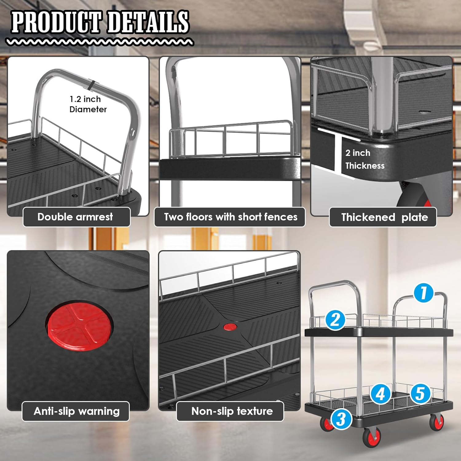 • 【Over 660 pounds of load capacity】 Solid thick bearing structure + 5 inch TPR wheels that provide great carrying capacity. The lower part of the 4-wheeled service utility truck adopts a frame structure design, which can evenly disperse the power of the car body. At the same time, the wheels can be protected and the lifespan is extended. Note: The top layer can only carry 330 pounds