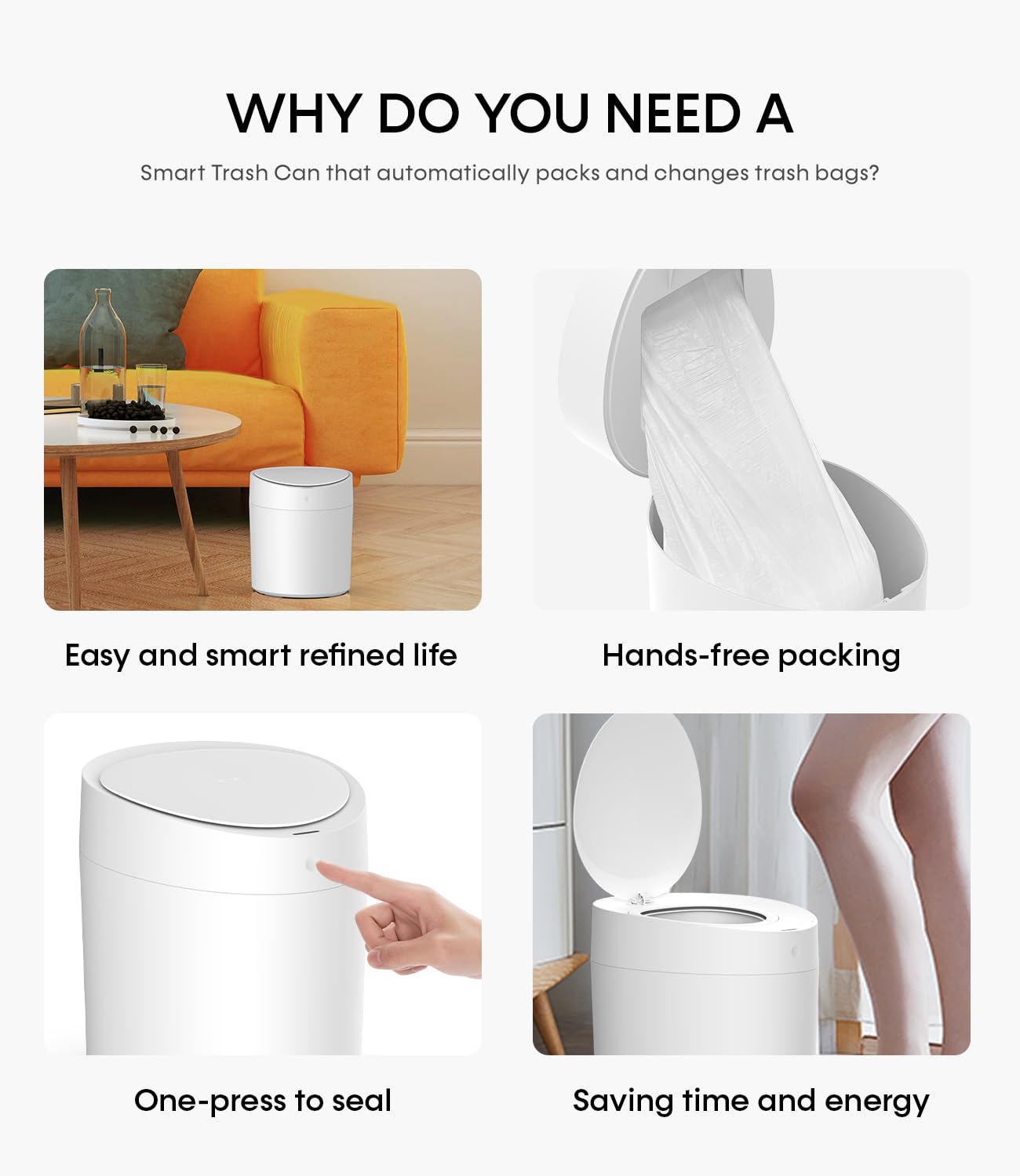 • Self-Sealing and Changing in One-Touch: Just press and hold the touch button of the automatic trash can for 3 seconds to achieve one-click automatic packaging. After packaging, press main lid button after hearing the beep sound. After the lid is automatically bounced, take out the trash bag and turn off the lid manually to automatically change a new trash bag.