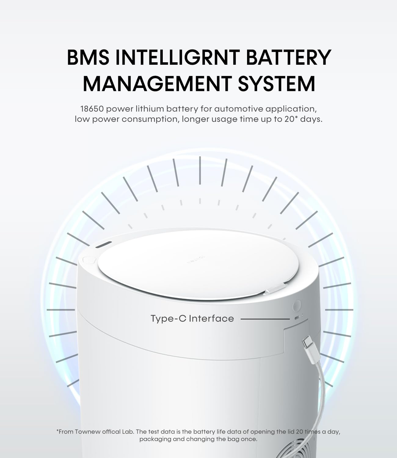 • Touch-free Motion Sensor Lid: The townew garbage can is equipped with latest Infrared Motion Sensor that detects movement and all approaching objects within 35 cm above the sensor panel to open the small lid immediately.