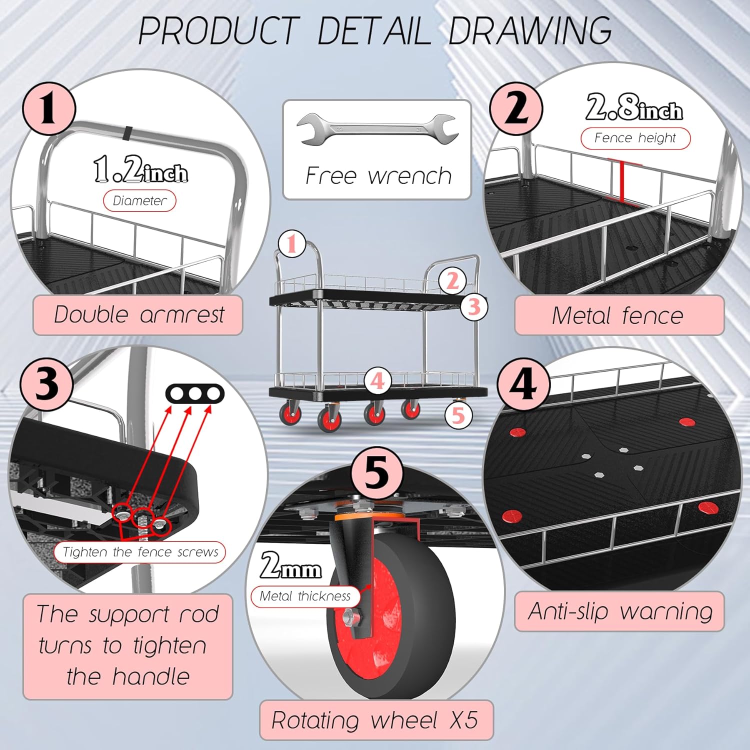 • 【Double Layer Design】 The platform of the cart is made of 2 pieces of brand-new plastic materials. The new double-layer cart consists of support rods connected. The design of double handrails and 5 rotating wheels improves the convenience in the use process. The detachable fence on the side can transport articles of different sizes. the textured platform surface help prevents cargo from slipping off the cart. It is a practical tool cart in life