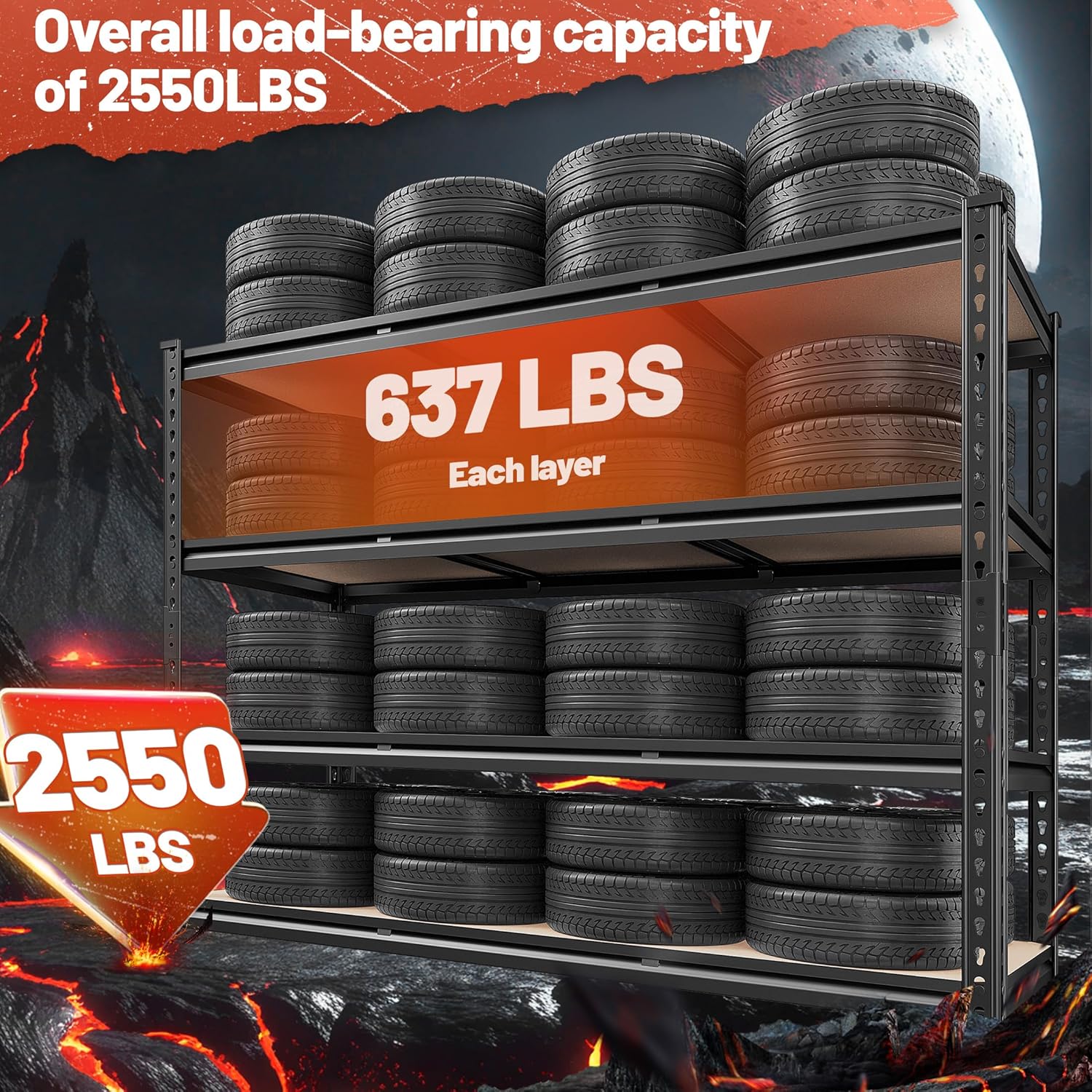 • 【2550LBS Capacity Garage Shelving】This garage shelving is made of heavy duty metal. The rolled edge thickened column effectively protects your hands, and the thickened design makes the load-bearing better, ensuring the single-layer load-bearing capacity of the garage shelf 637LBS and the total load-bearing capacity of 2550LBS. It is suitable for garage, workplaces, warehouse, living room, kitchen, to store camping equipment, tools, kitchen supplies