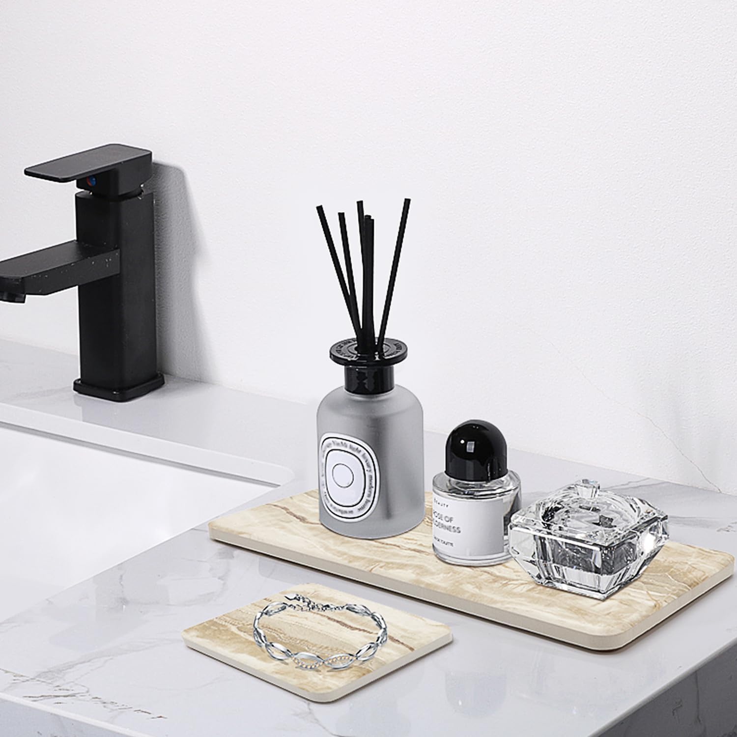 • INSTANT WATER ABSORBING: Made of absorbent ceramic with tiny porous, the fast drying stone trays soak up water quickly and dry in minutes, that can keep your bathroom countertop or kitchen sink dry and tidy.