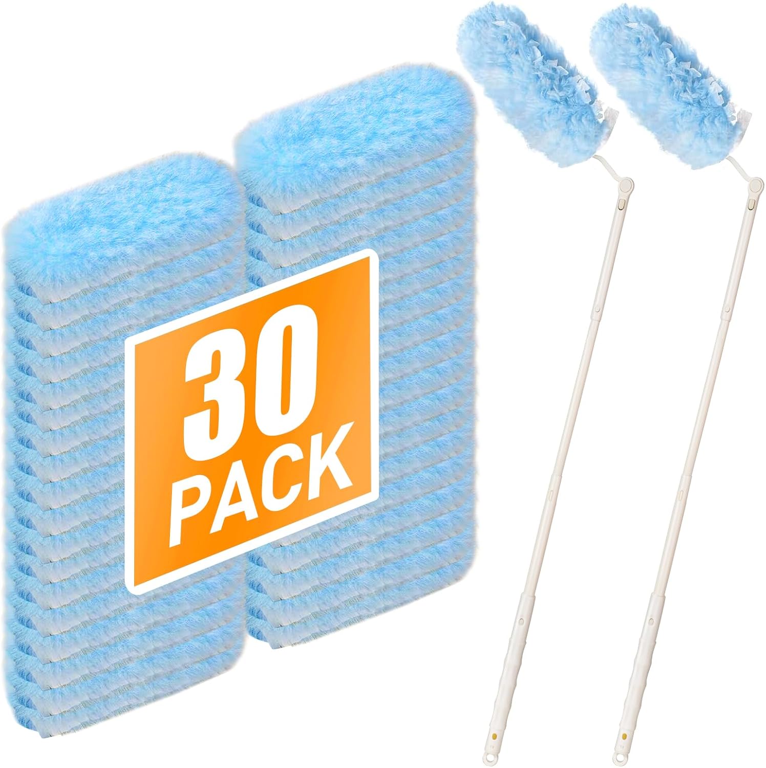 Heavy Duty Duster Refills for Swiffer Dusters, 360° Multi-Surface Microfiber Duster Refills with 2.5 ft Extended Handle, Unscented Disposable Feather Dusting Kit (30 Count Refills, 2 Handles)