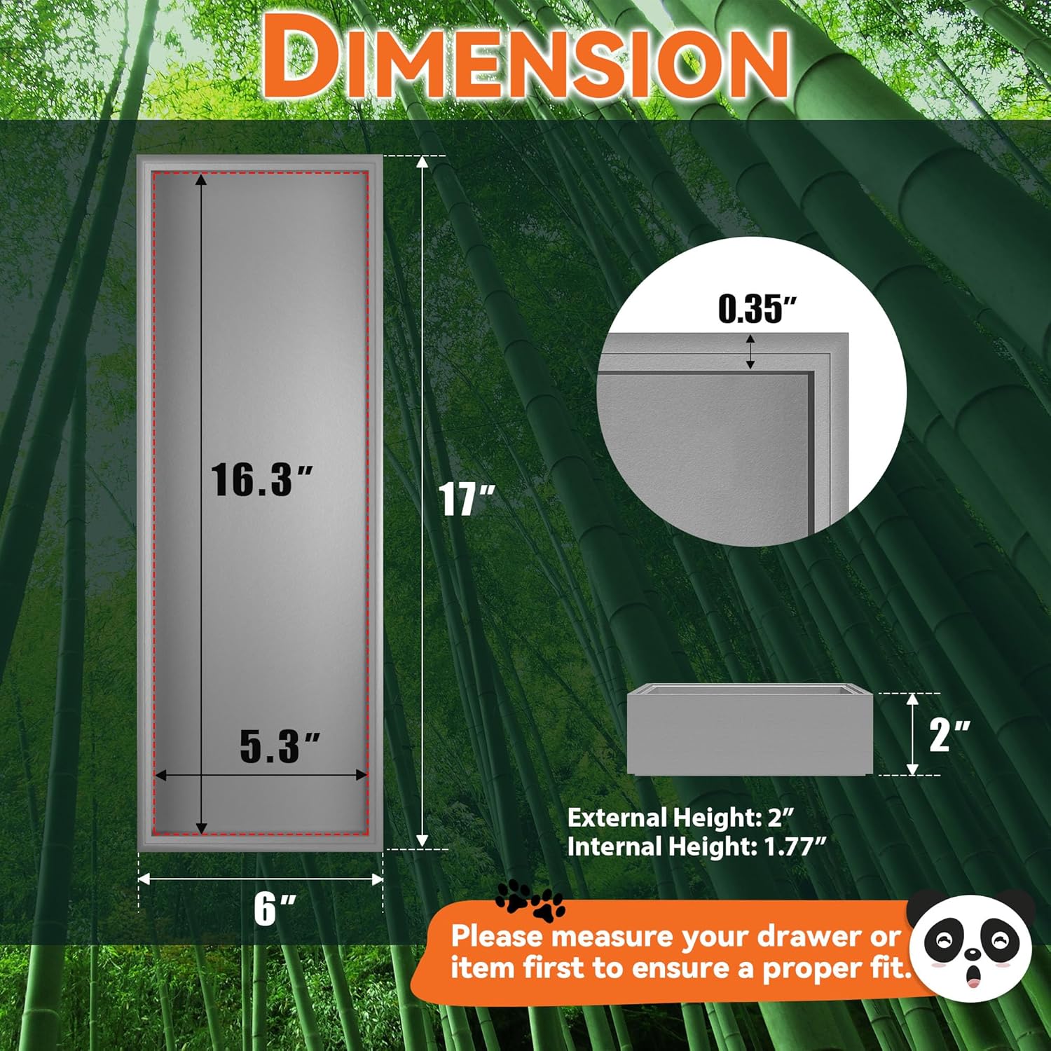 • Each bamboo drawer organizer measures: external size: 17" L x 6" W x 2" H; internal size: 16.3" L x 5.3" W x 1.77" H. Please check the size before purchasing