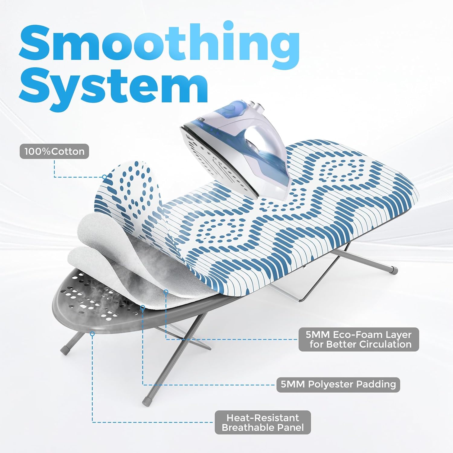 • Heat-Resistant Cover: Our tabletop ironing board with padded felt underlay and 100% cotton cover, effectively preventing being damaged due to high temperature during ironing, ensuring long-term and stable use. Flat and smooth cloth cover without any grooves for wrinkle-free clothing, is great ideal for suit, dress,collared shirt or other any garment
