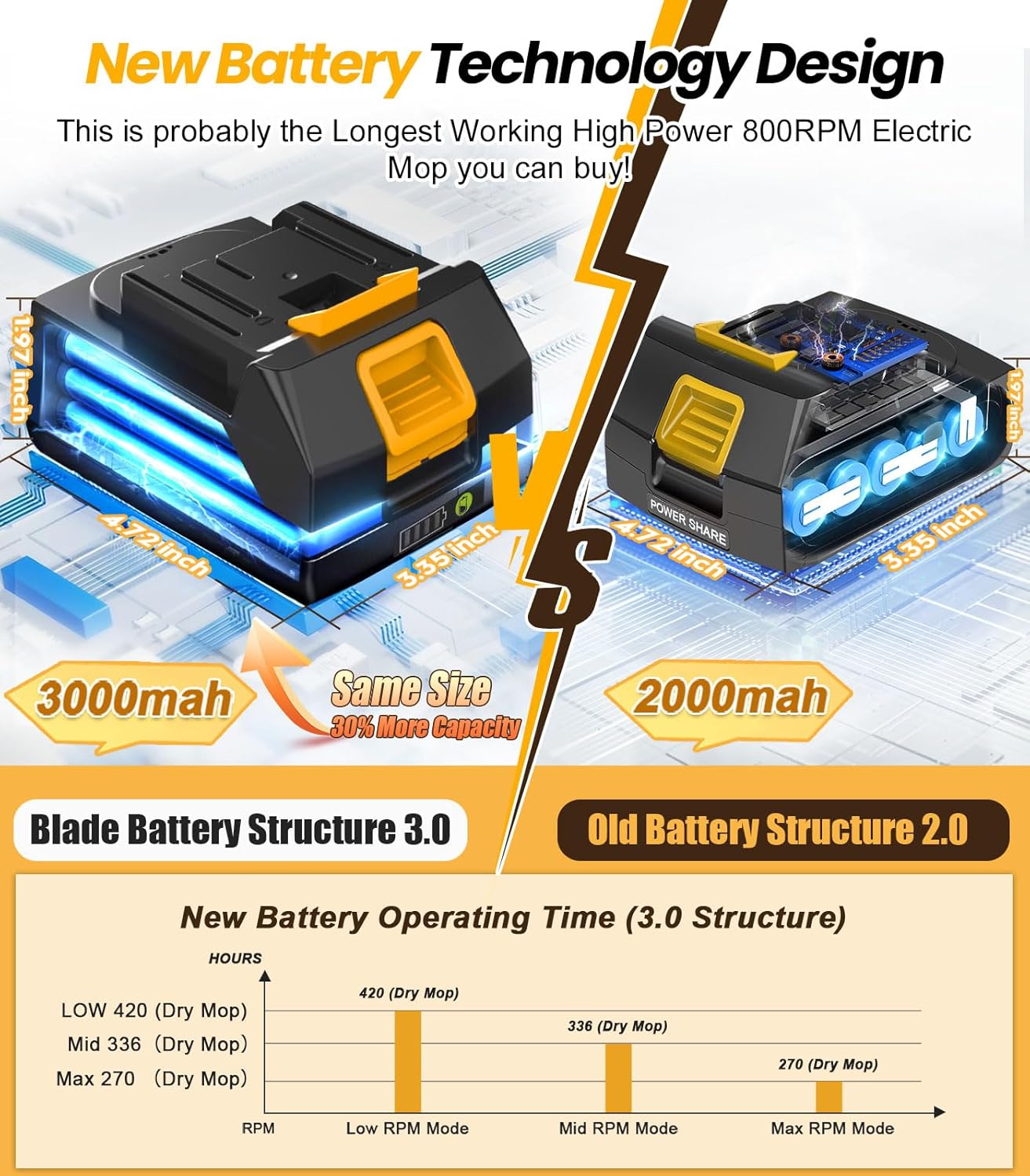 • 【𝐁𝐞𝐬𝐭 𝐂𝐞𝐫𝐭𝐢𝐟𝐢𝐞𝐝+ 𝟔,𝟎𝟎𝟎𝐦𝐀𝐡 𝐋𝐚𝐫𝐠𝐞 𝐁𝐚𝐭𝐭𝐞𝐫𝐲 𝐚𝐧𝐝 𝐜𝐡𝐚𝐫𝐠𝐢𝐧𝐠 𝐭𝐢𝐦𝐞】This is probably the Longest Working 800RPM power mop you can buy! The latest technology 3.0 blade compression construction battery is the same size and has 30% more capacity compared to the old 2.0 construction battery. 2.5 hours to fully charge,two batteries can work continuously for 420 minutes (low speed mode). Enough time to deep clean floors, bathrooms, and everywhere in your house