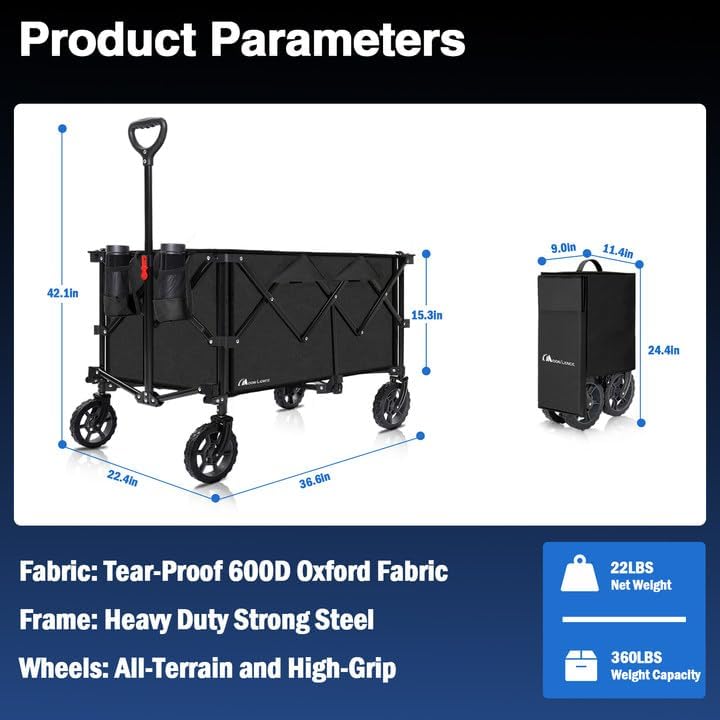 • Heavy-Duty Build: The alloy steel frame supports up to 360 lbs; Made with durable, waterproof 600D Oxford fabric that's easy to clean and built to last—ideal for your beach wagon needs