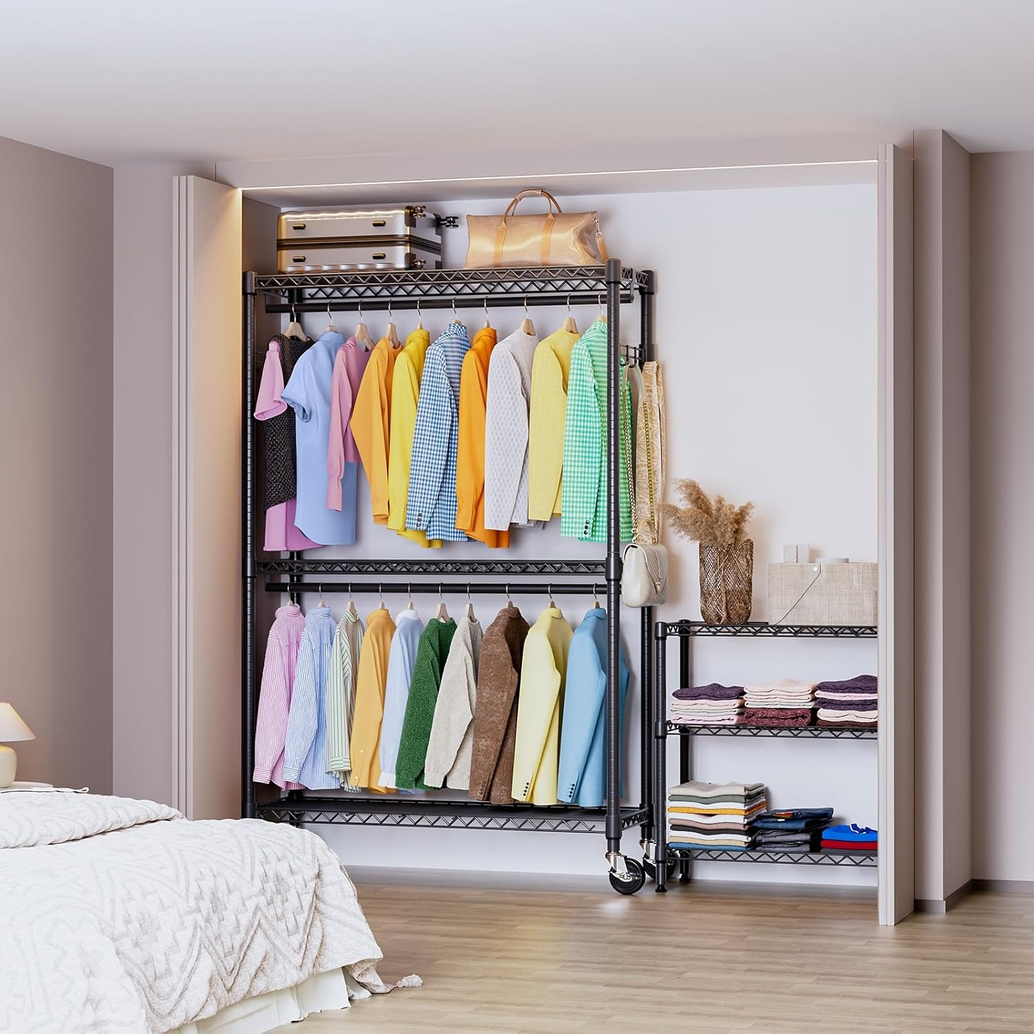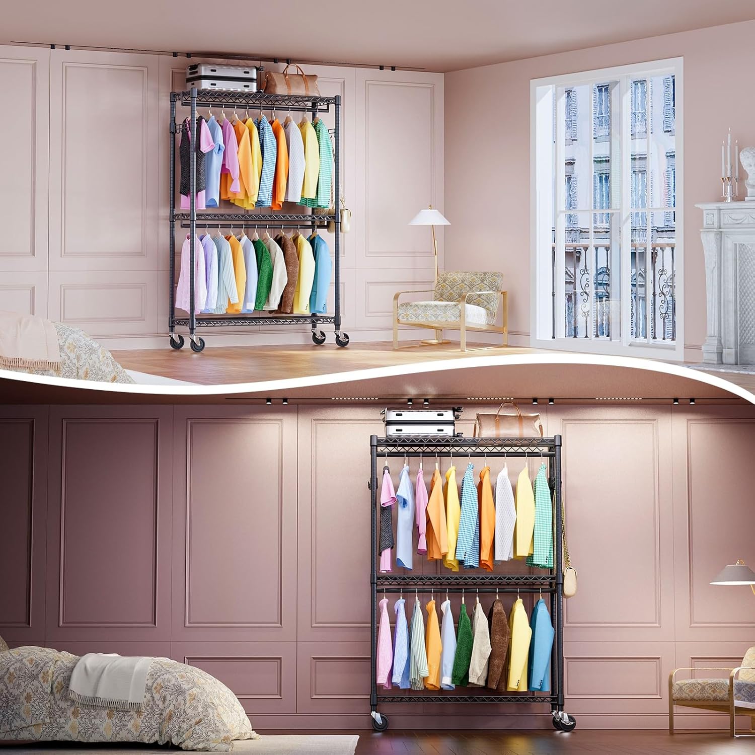 • Rotatable 360° Wheels And Versatile: This rolling clothes rack has 4 heavy-duty rolling wheels, and thus you can easily move anywhere you need, such as the showroom entry closet, bathroom, garage, laundry room, hallway, balcony, bedroom, cloakroom, and more. And 2 of them are lockable, which ensures more security