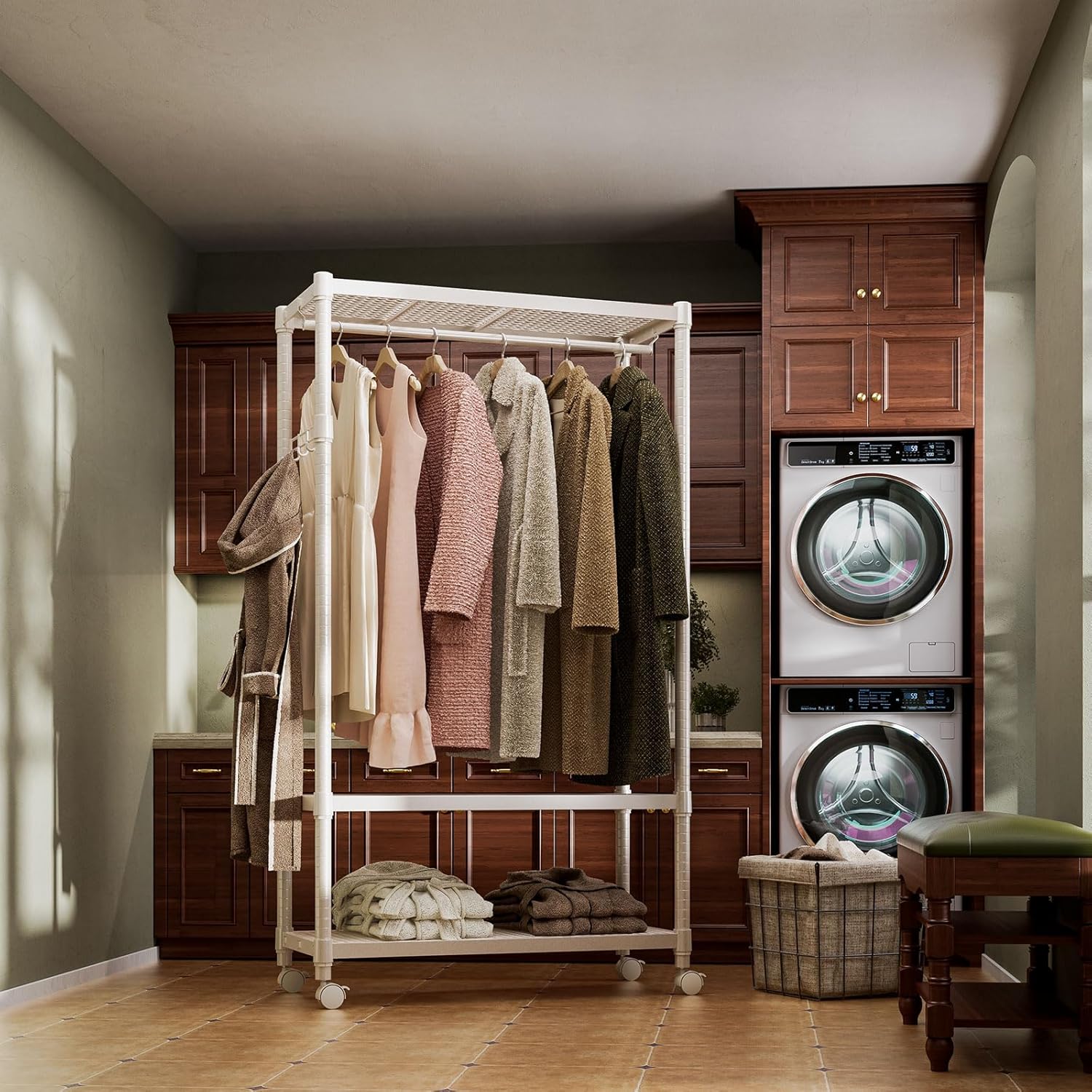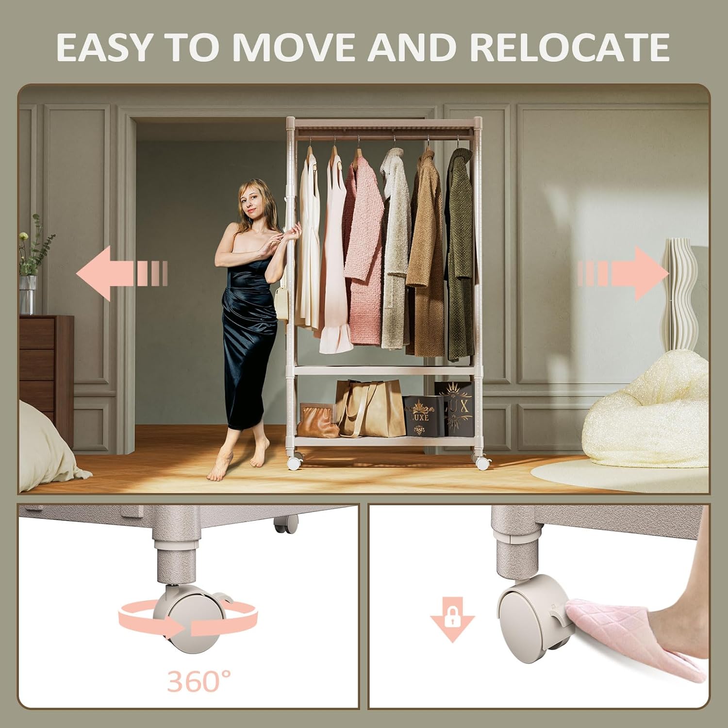 • Rotatable 360° Wheels And Versatile: This rolling clothes rack has 4 heavy-duty rolling wheels, and thus you can easily move anywhere you need, such as the showroom entry closet, bathroom, garage, laundry room, hallway, balcony, bedroom, cloakroom, and more.