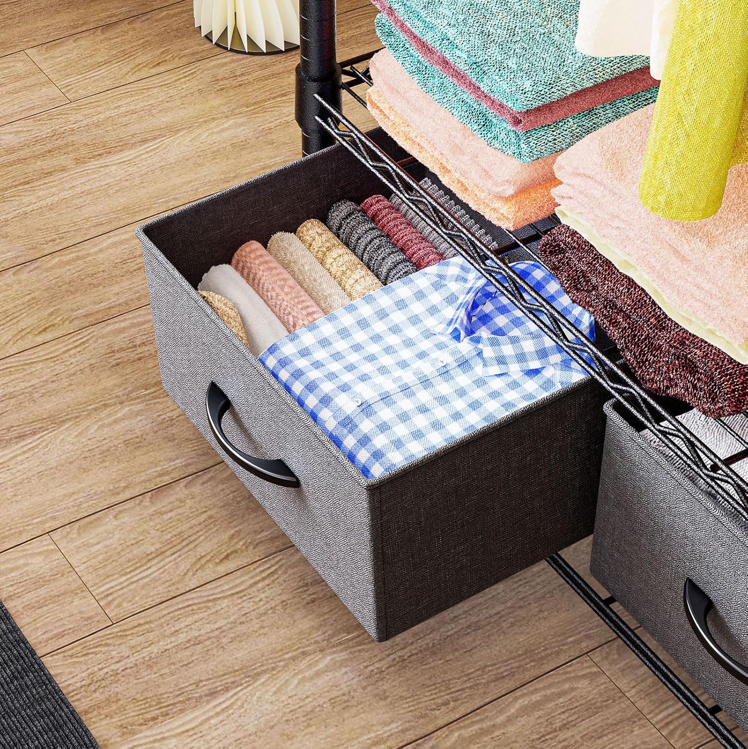 • 2 Fabric Drawers for Extra Storage: This clothing rack is designed with 2 fabric drawers with easy-pull handles, offering concealed storage for socks, underwear, wallets, and more. A great addition to wardrobe closets, it helps keep your space tidy and organized.