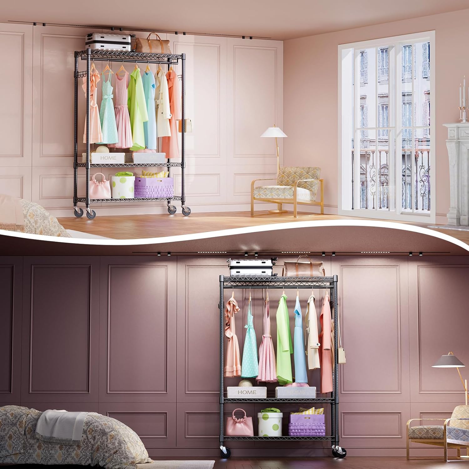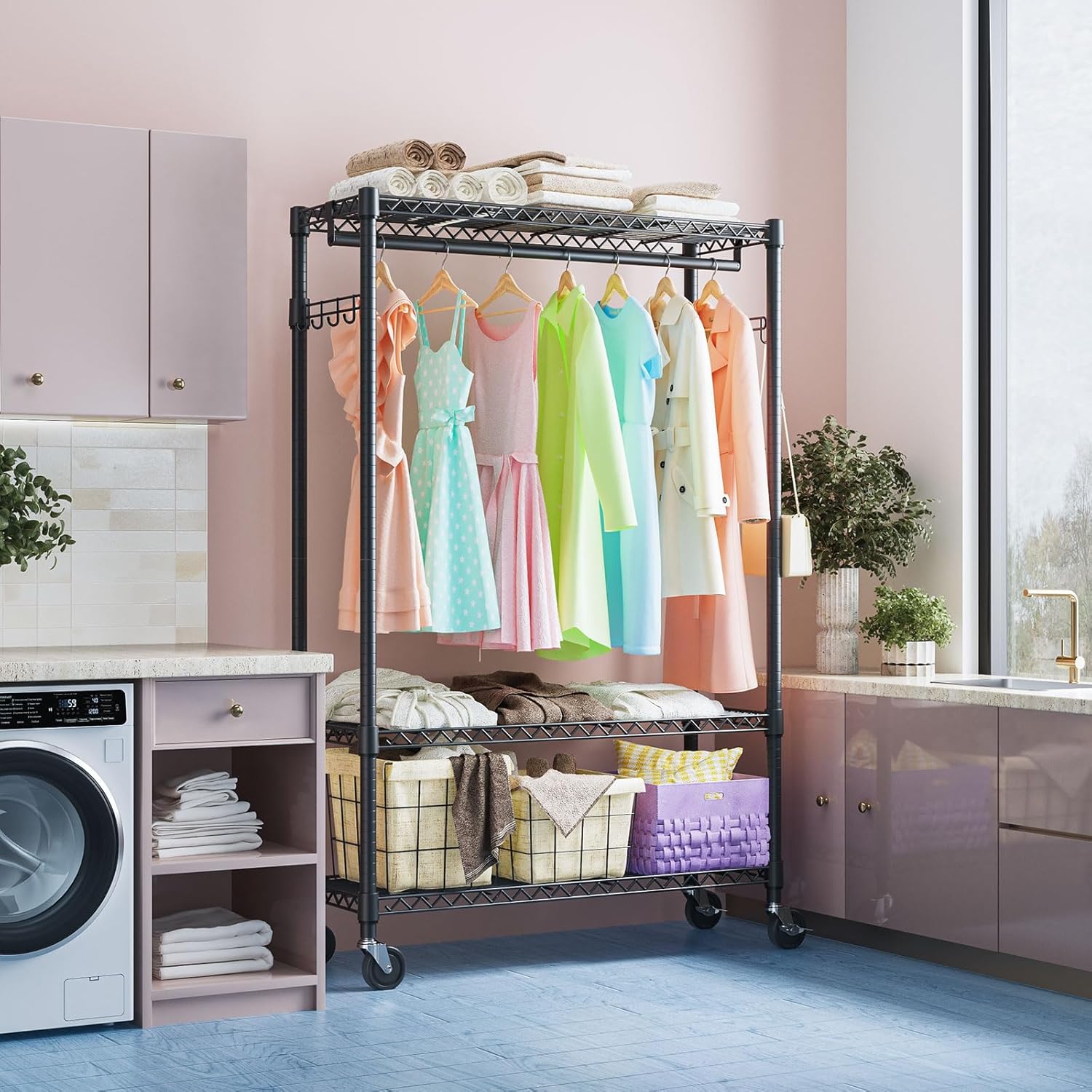 • Rotatable 360° Wheels And Versatile: This rolling clothes rack has 4 heavy-duty rolling wheels, and thus you can easily move anywhere you need, such as the showroom entry closet, bathroom, garage, laundry room, hallway, balcony, bedroom, cloakroom, and more. And 2 of them are lockable, which ensures more security