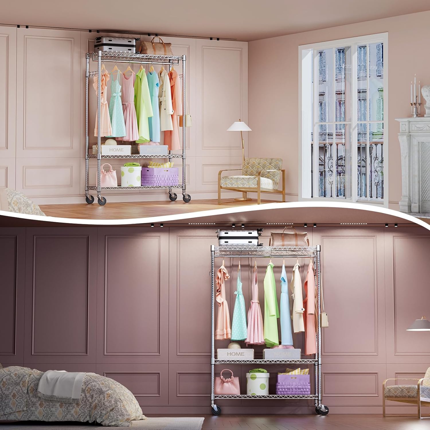 • Rotatable 360° Wheels & Versatile Use: This rolling clothes rack features 4 heavy-duty 360° swivel wheels for easy mobility across various spaces, including your laundry closet, showroom, entryway, bathroom, garage, hallway, bedroom, or cloakroom. Two wheels are lockable for added stability and security during use.
