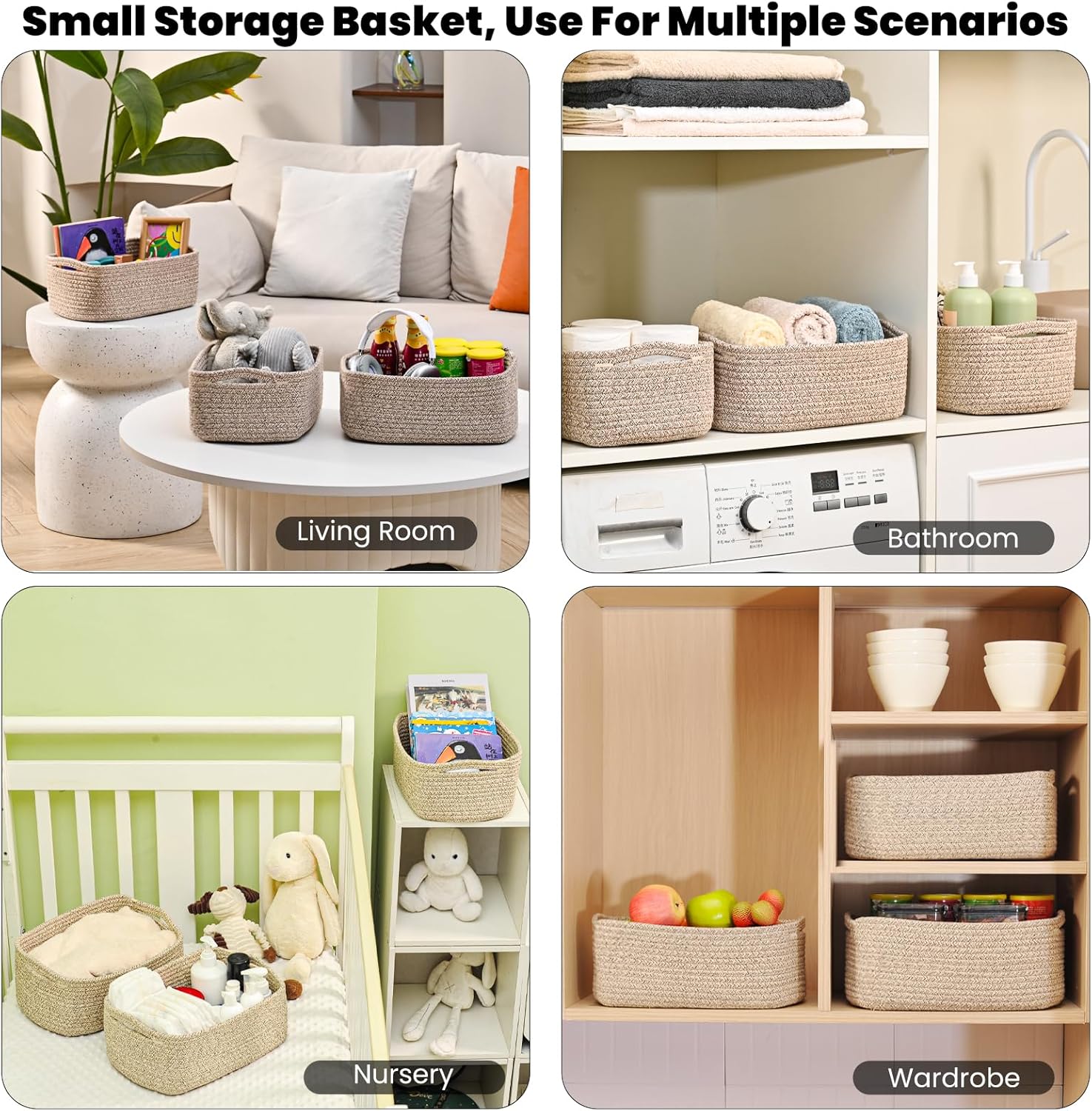 • Multi-Purpose Mini Baskets: Looking for cute baskets for gifts? This small storage basket is an excellent choice, offering a little basket charm that's perfect for gifting. And it can be sorted to store cosmetics, jewelry, baby diapers, remote controls, keys, credit cards, wallets, charging cables, toys, snacks, paper towels and more