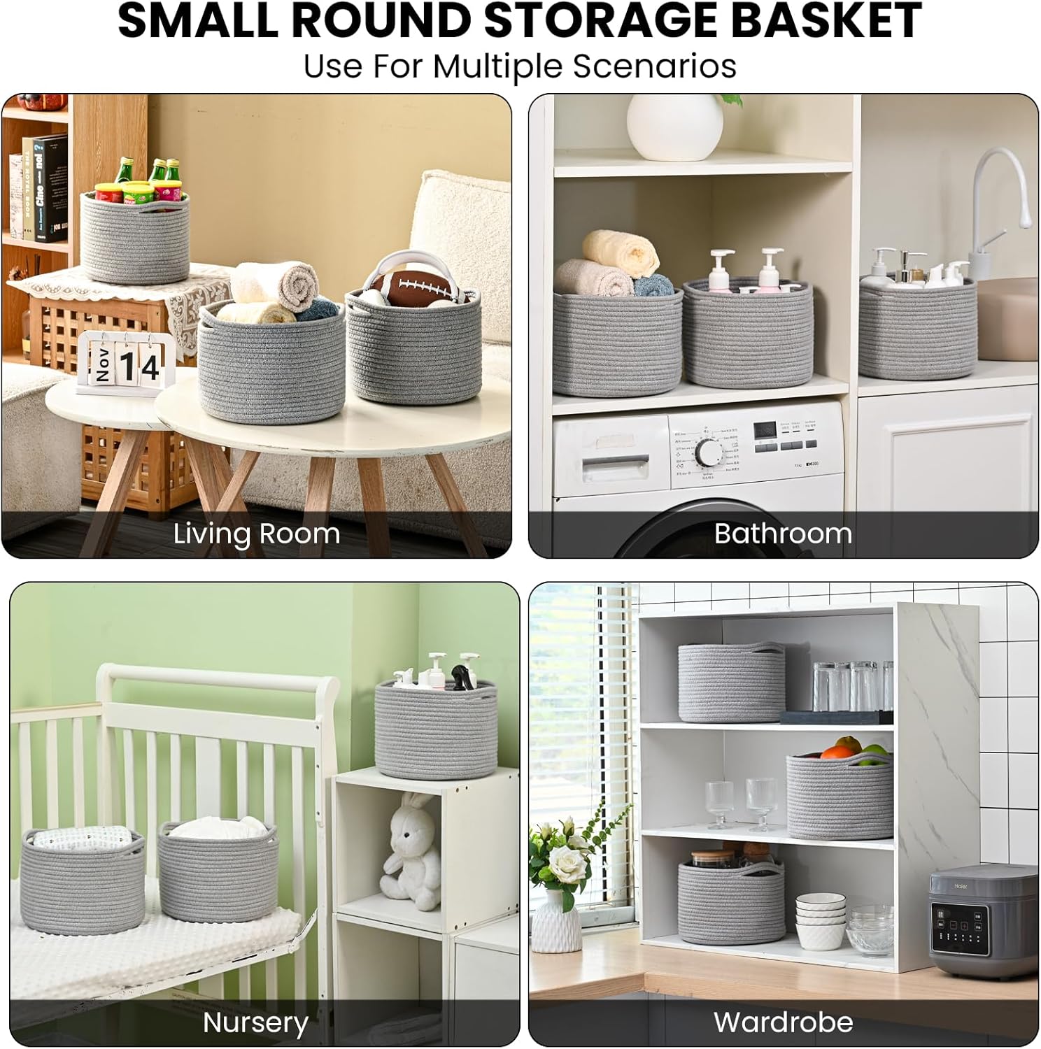 Small Storage Baskets for Organizing, Organizer Baskets for Shelves, Small Woven Basket for Storage, Cute Basket for Gifts Empty, Soft Cotton Rope Baskets, 9.7"×9.7"×7" (3 Packs) Grey