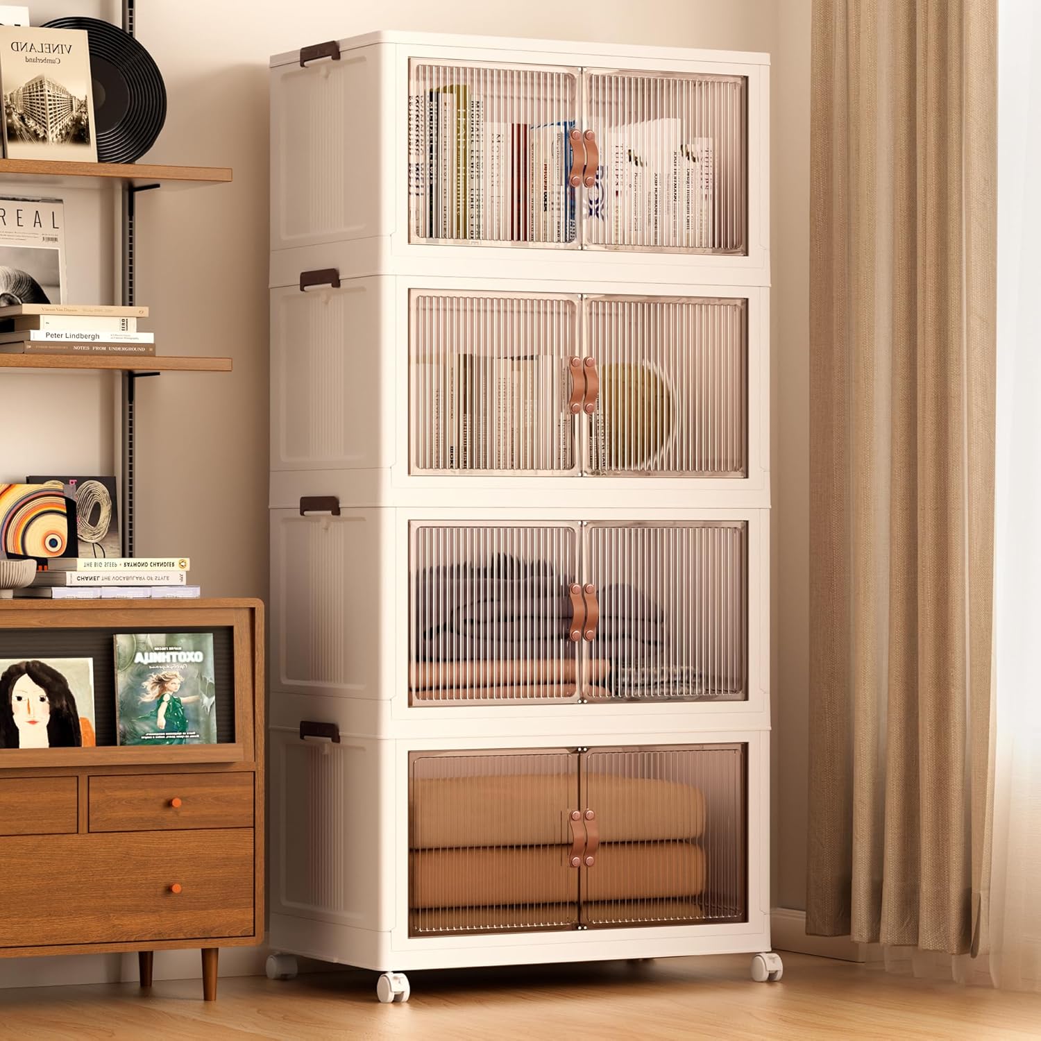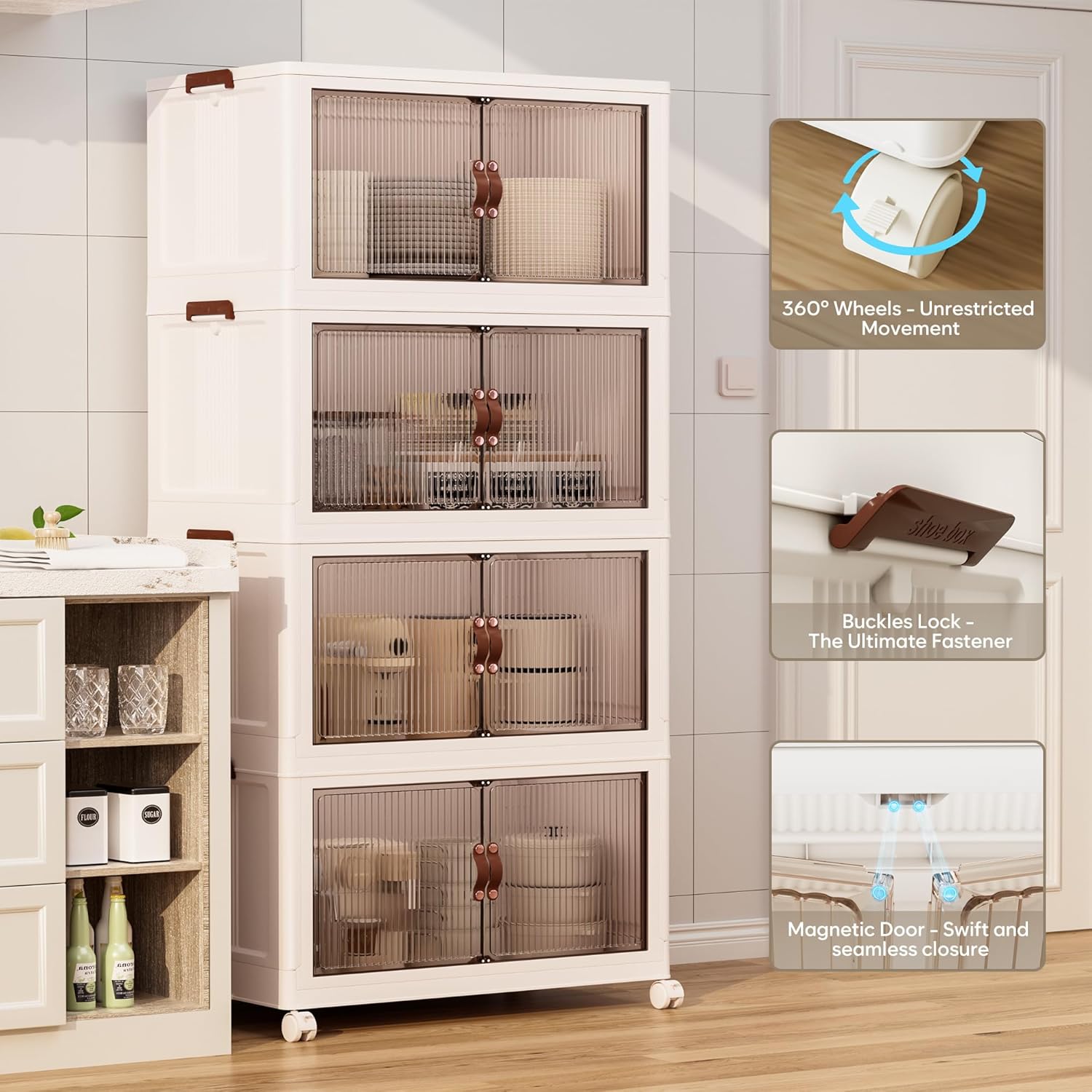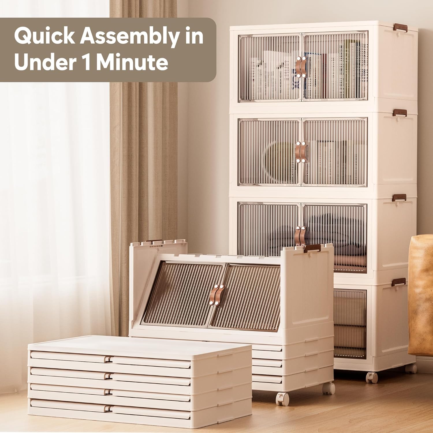 • 【Stackable & Magnetic Door & Rotating Wheels】The storage box has a groove design for stacking stackable storage bins. With side and rear buckles, the stacked boxes stay steady and secure. Equipped with four 360° rotating wheels, it’s easy to move and perfect for closet organizers and storage, keeping your space organized.