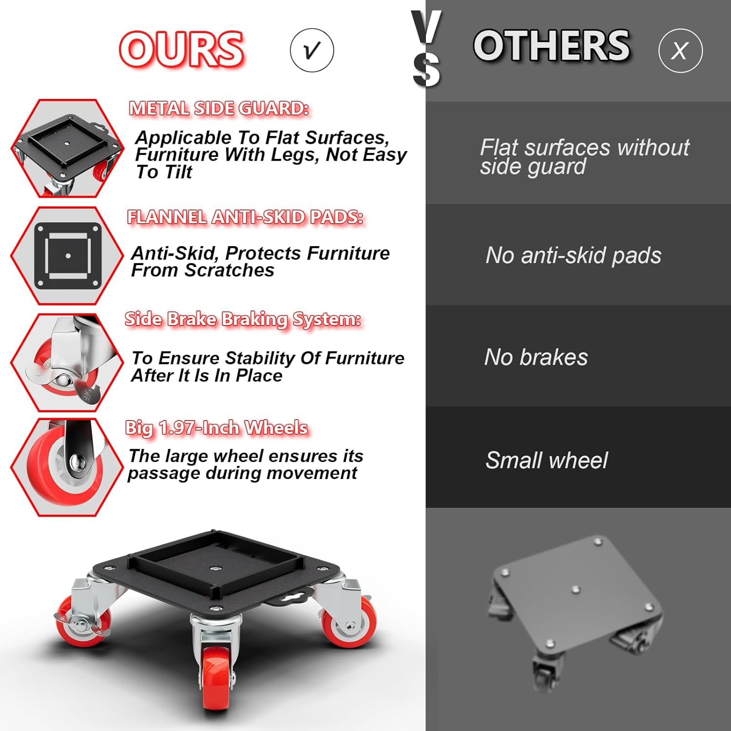 • [Smooth, Flexible Movement]:With five 1.97-inch single bearing large wheels,this moving dolly provides smooth,flexible rolling under heavy loads.The side brake system locks the wheels from moving forward and backward,ensuring stability once your furniture is in place,perfect for controlled heavy-duty transport.
