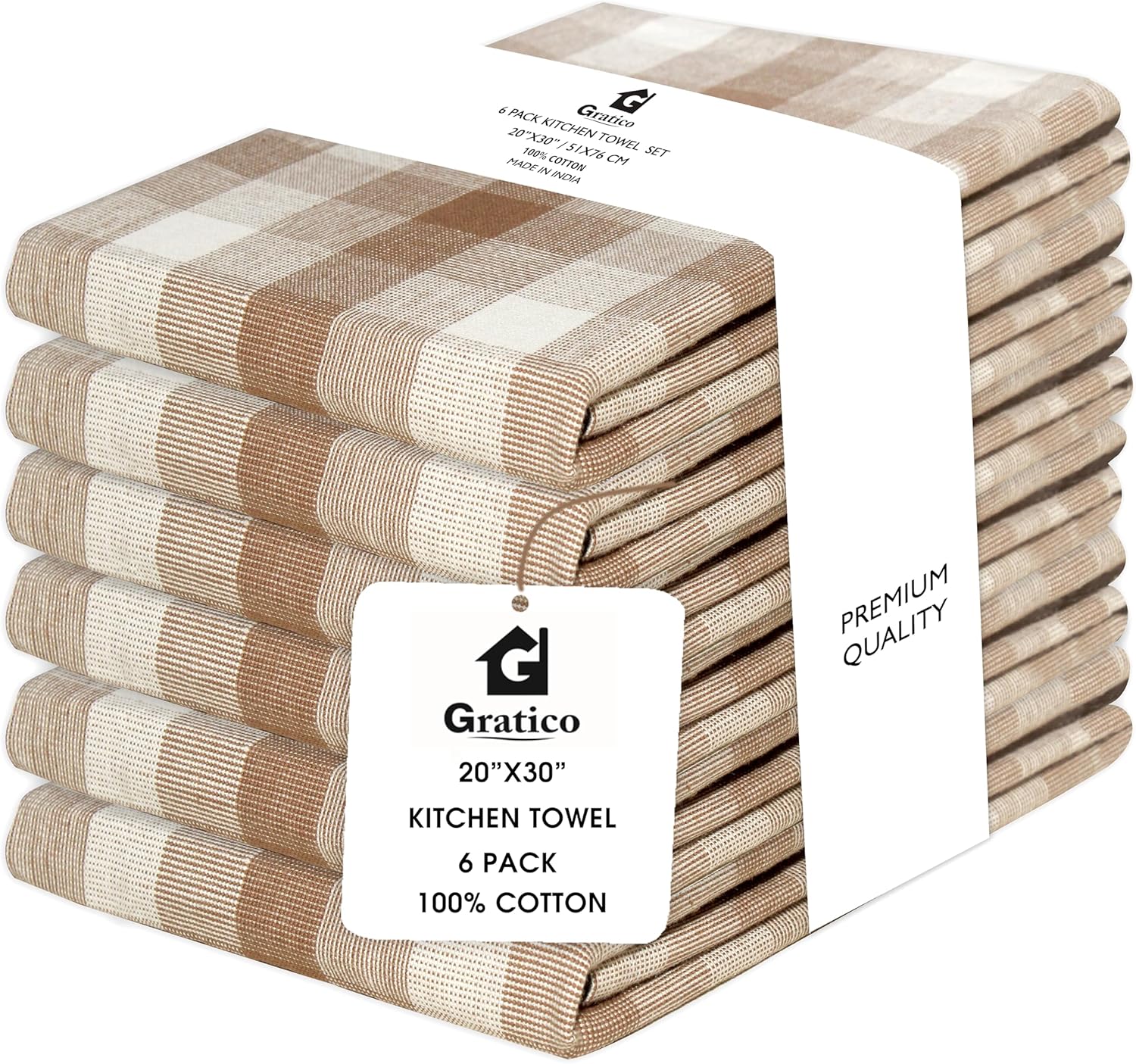 Kitchen Towels Set of 6 Brown/Ivory Checks 20x30 Inches 100% Cotton Highly Absorbent Kitchen Towels Premium Quality Ultra Soft Mitered Corners