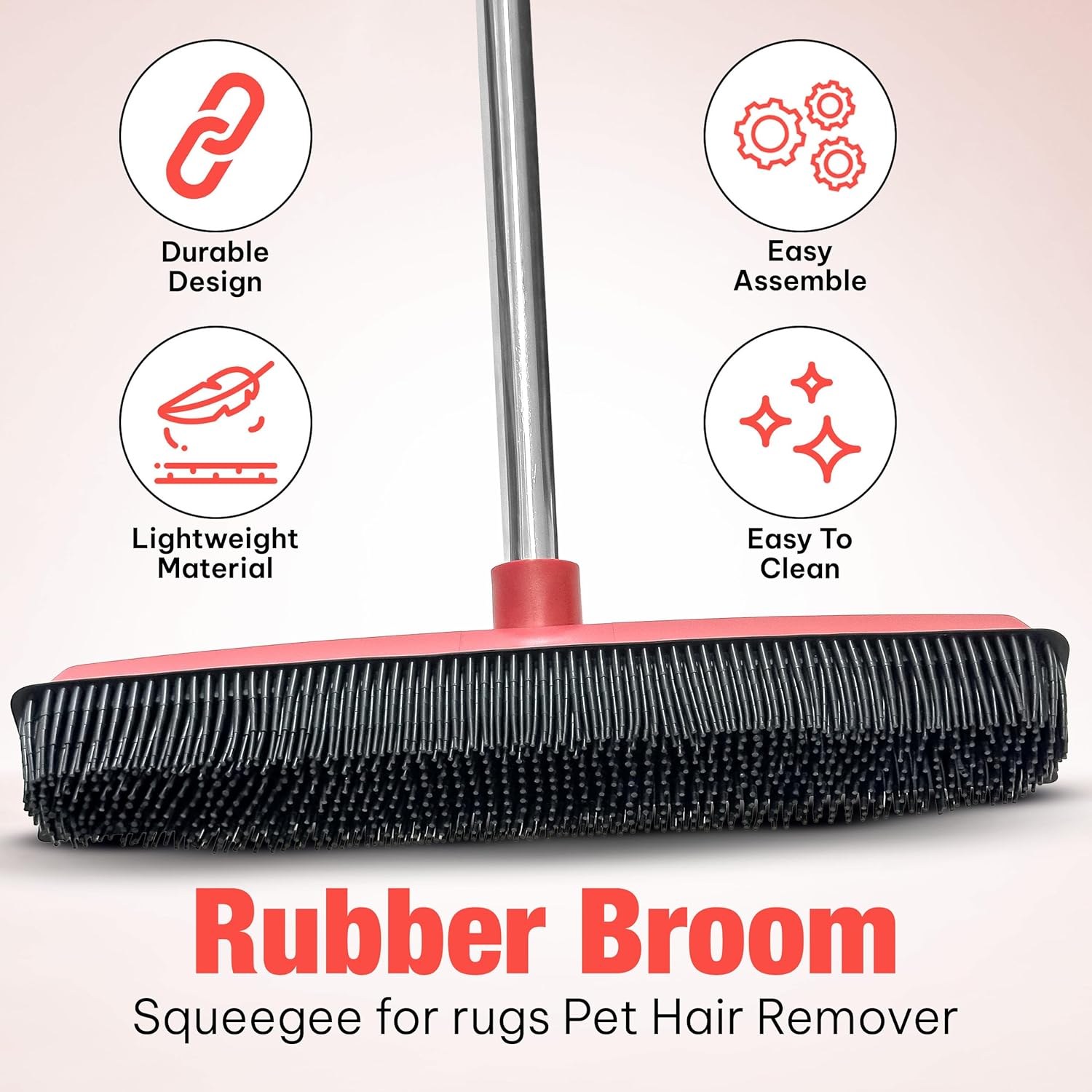 • 2-in-1 Rubber Broom & Squeegee: Designed for pet owners, our dog pet hair broom for carpet features soft, non-scratch rubber bristles and a built-in squeegee, ideal for cleaning up pet messes, liquid spills, and debris on smooth surfaces like windows, showers, and tiles