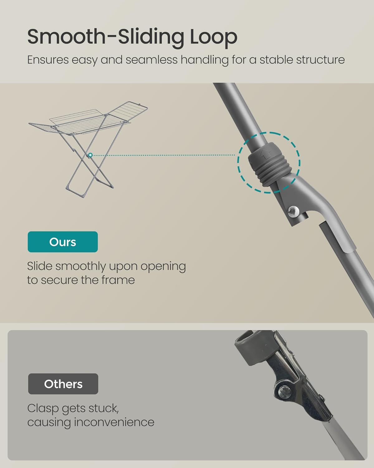 • [Thoughtful Details] This drying rack features a smooth-sliding loop, a plastic clip that keeps wings securely in place when folded, and floor-friendly plastic feet