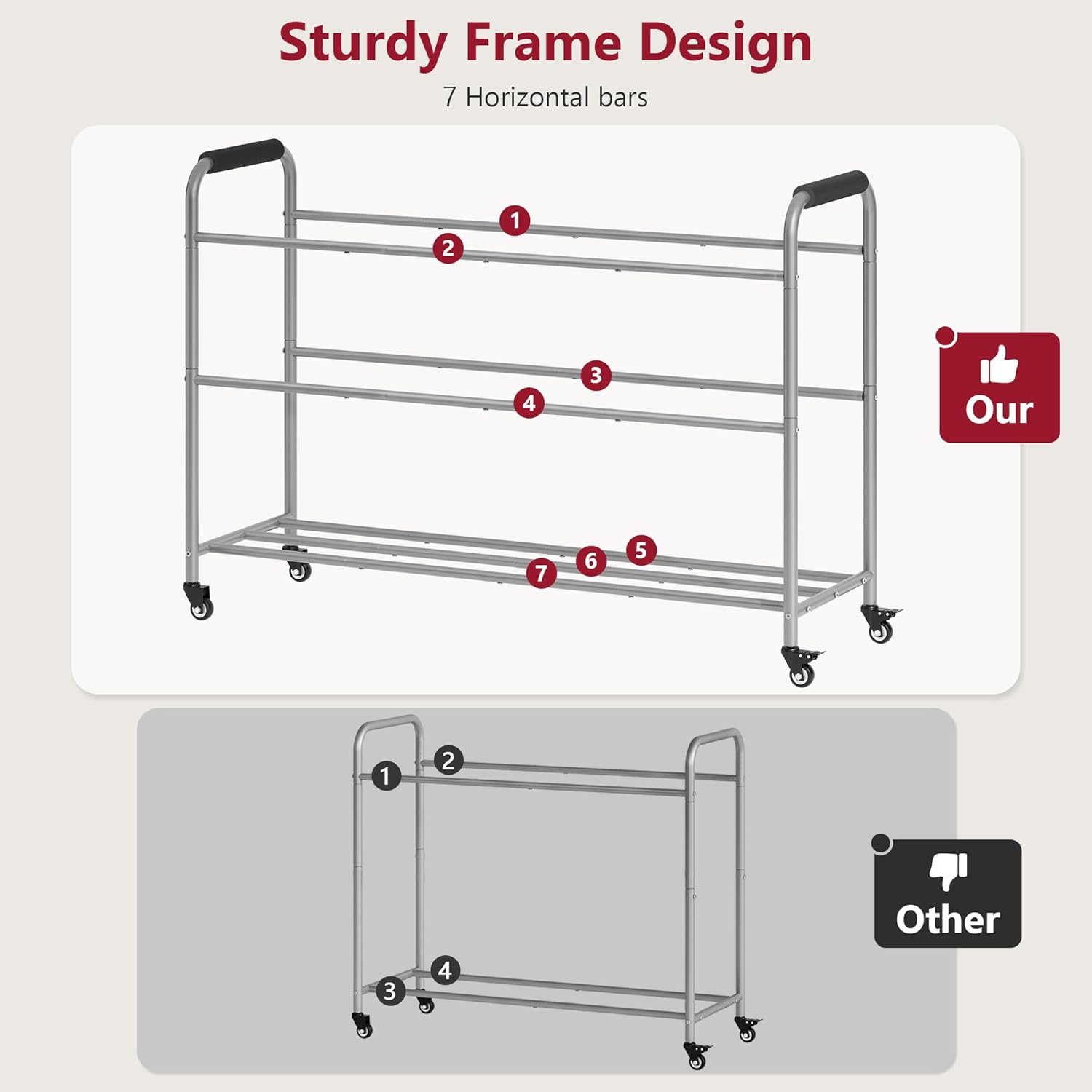 • 【Sturdy Metal Frame】Made of high-quality metal, it has good load-bearing performance. 7 metal horizontal bars make the rolling laundry basket frame more stable, and the horizontal bars at the bottom of the laundry sorter hamper prevent the bags from sagging when loading clothes.