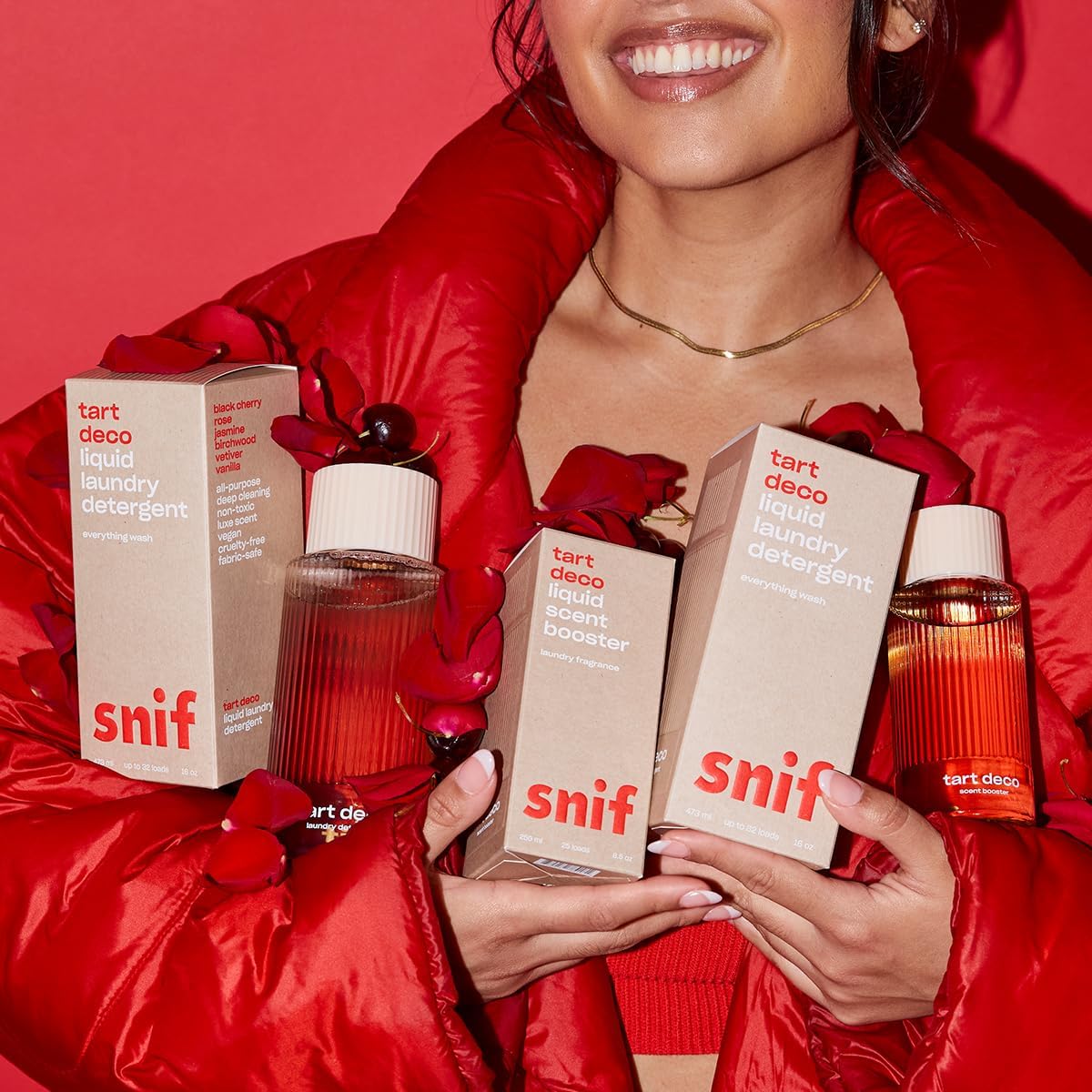 • TART DECO: You don’t need to invent time travel to indulge in this nostalgic, youthful scent . The Tart Deco Liquid Scent Booster’s juicy scent elevates your laundry with a pour of black cherry, rose, jasmine, birchwood, vetiver and vanilla. Why be a snack when you can be a dessert?