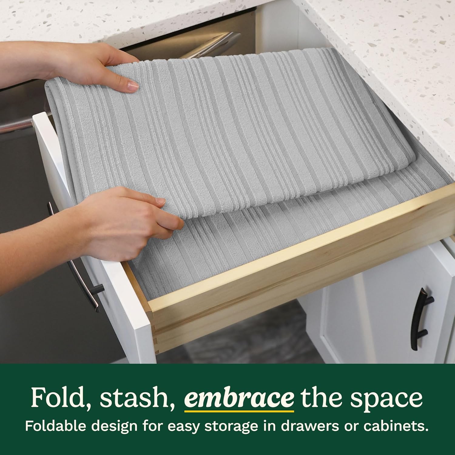 • SLEEK DESIGN, EASY STORAGE – Foldable for easy storage in drawers or cabinets, with a hanging loop for convenient alternative storage. These 18” x 24” xl dish drying mats come in stylish patterns, making them the perfect kitchen accessories for countertops while saving space at the same time.