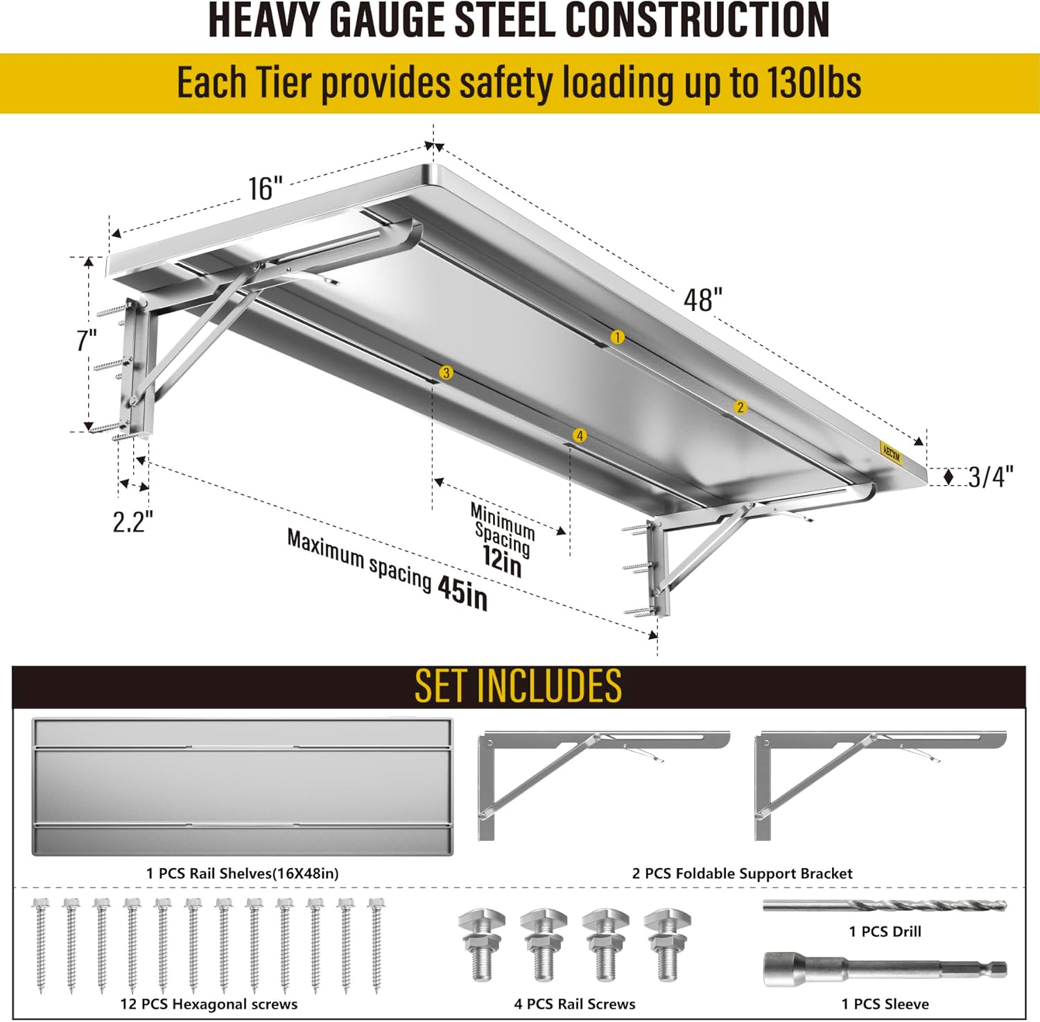 • KIT INCLUDES:Includes 1pcs of face plate; 2 Folding Brackets; 12 Hexagonal screws (Hardened ∅0.2" L/2"); 4 Sets of rail attachment bolts; 1 Drill bit; 1 Socket; 1 installation manual. All hardware of AECXM Professional Series Wall Mounted Shelf are under strict quality control and testing, We strive to provide our customers with a quality shopping experience, If you have any questions, Please feel free to contact us