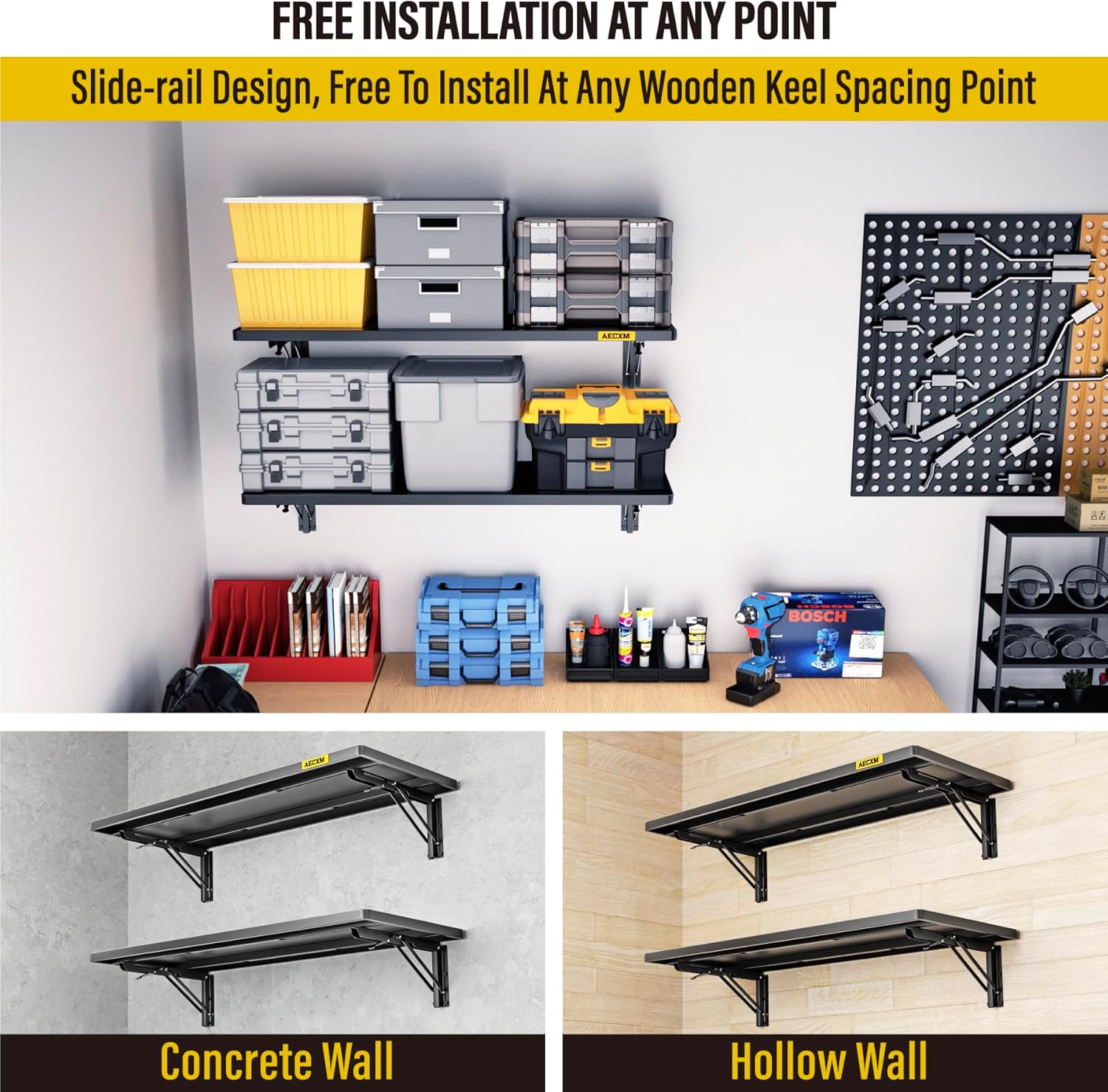 • SUPERIOR DESIGN: The foldable garage storage shelf panel is made of whole steel plate, The surface of matte high temperature powder baking paint, Flat and smooth, Panel with sliding rail design, The bracket can be installed freely in the range of 8"-33" spacing of wood wall keel, And at the same time it adopts folding bracket, Which can be freely stowed away or unfolded